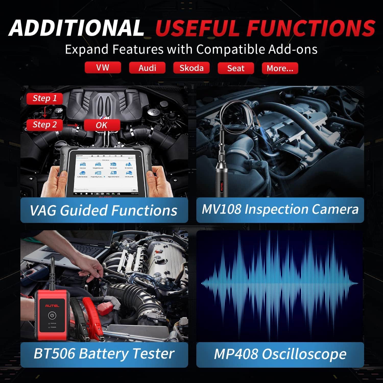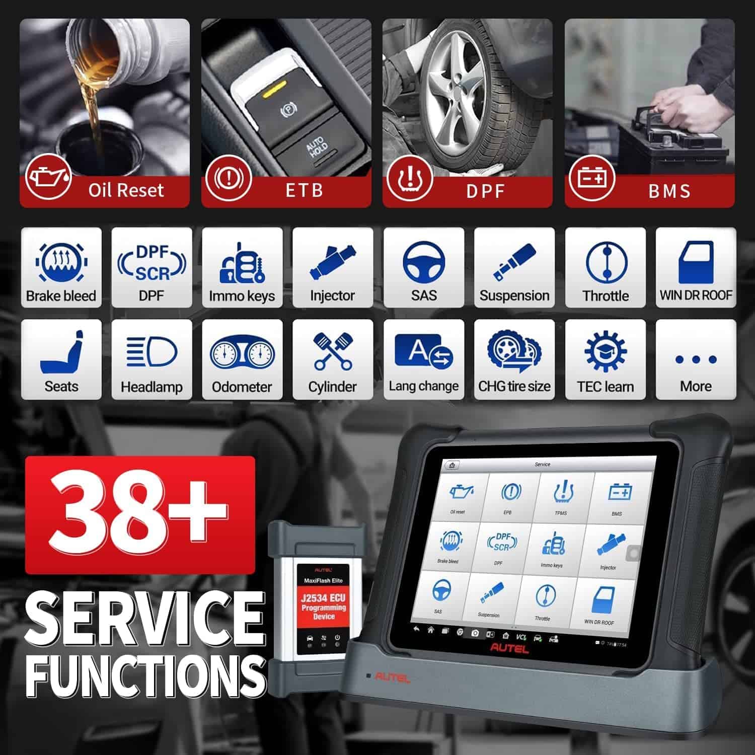 3. 38+ Servicios y Funciones Especiales Autel MaxiSys Elite II es una herramienta de escaneo integral y potente que puede ofrecer 38+ diferentes reinicios y servicios, como Reinicio de Aceite, Sangrado de Frenos, EPB, SAS, BMS, Acelerador, Codificación de Inyectores, Aprendizaje de Cigüeñal, Prueba de Equilibrio de Potencia, Corrección de Odómetro, etc. Autel Elite 2 también puede realizar adaptación inicial, autoaprendizaje o alguna función de detección automática después de que se haya realizado un mantenimiento o reinicio o se haya reemplazado algún componente relacionado en el sistema de control electrónico.