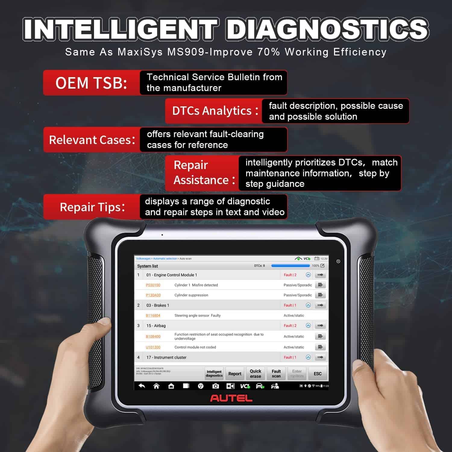 2 Años de Actualización Gratuita (VALOR $2590) & Diagnóstico Inteligente Autel MaxiSys Elite II soporta diagnósticos inteligentes después de actualizar el software a la versión V2.42, realiza la misma función que Autel Ultra. Después de escanear la ECU del vehículo, Autel Elite II clasificará los códigos de error por prioridad, instruyendo al técnico a obtener un diagnóstico preciso consultando TSB, Repair Assist, Repair Tips, Casos Relevantes. (Consejo: no soporta mapa de topología.