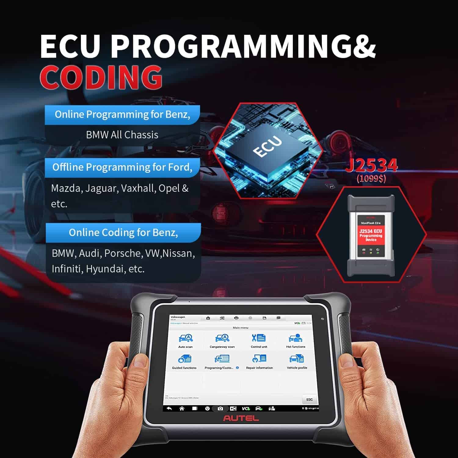 2. Programación & Codificación en Línea de ECU Viene con J2534 VCI de 1099$, Autel MaxiSys Elite II es capaz de programación en línea de la ECU para BMW y Benz: reemplazar software y firmware de ECU, programar nuevos datos adaptativos, actualizar nuevas ECUs y más. También soporta programación fuera de línea. Además, soporta codificación en línea de la ECU para programar ECUs en blanco, emparejar o inicializar componentes, desbloquear funciones ocultas, configuraciones de arranque/parada automática, solucionar problemas complejos como la capacidad de conducción, pérdida de potencia, mejorar la eficiencia de combustible, etc.