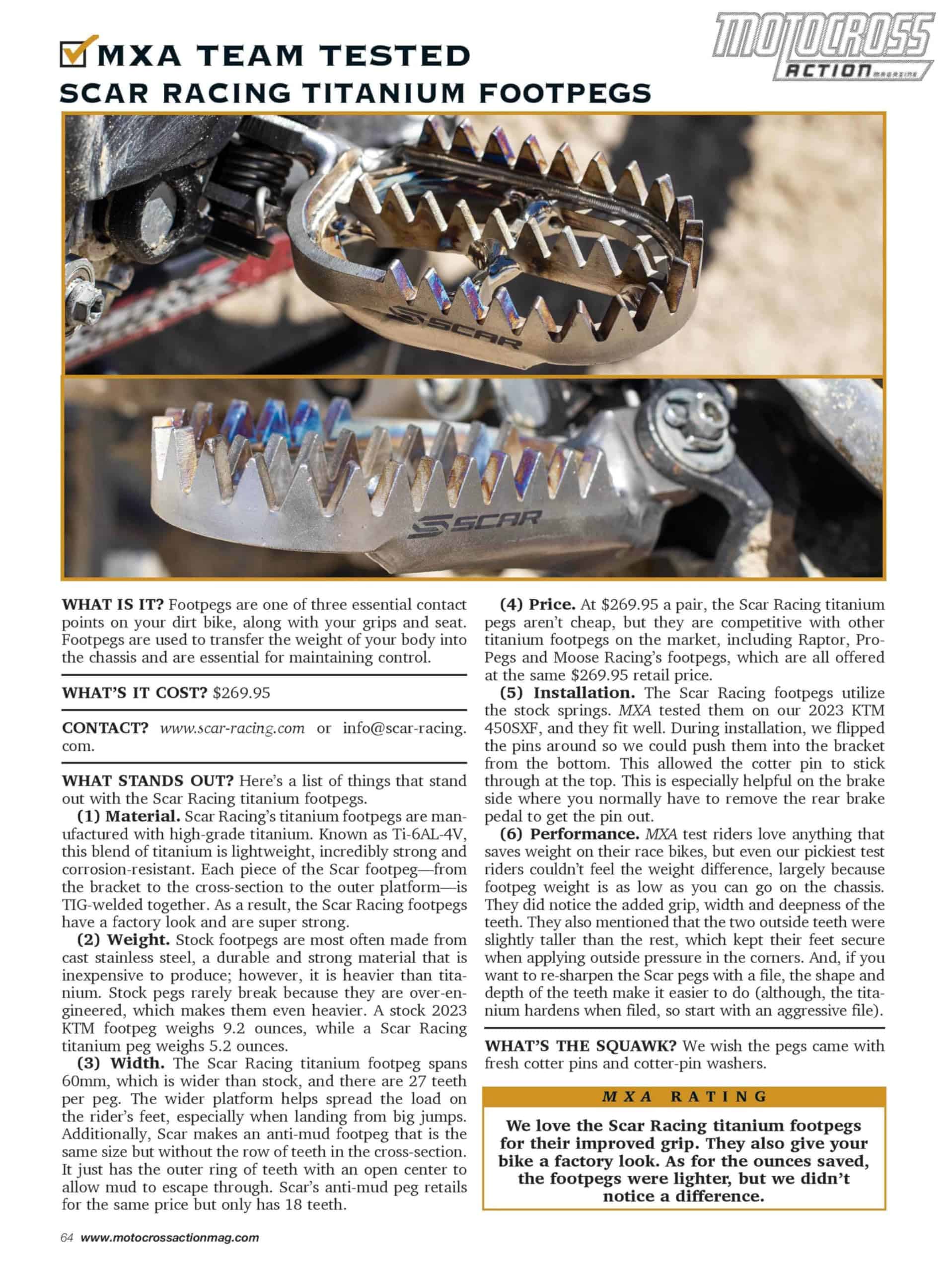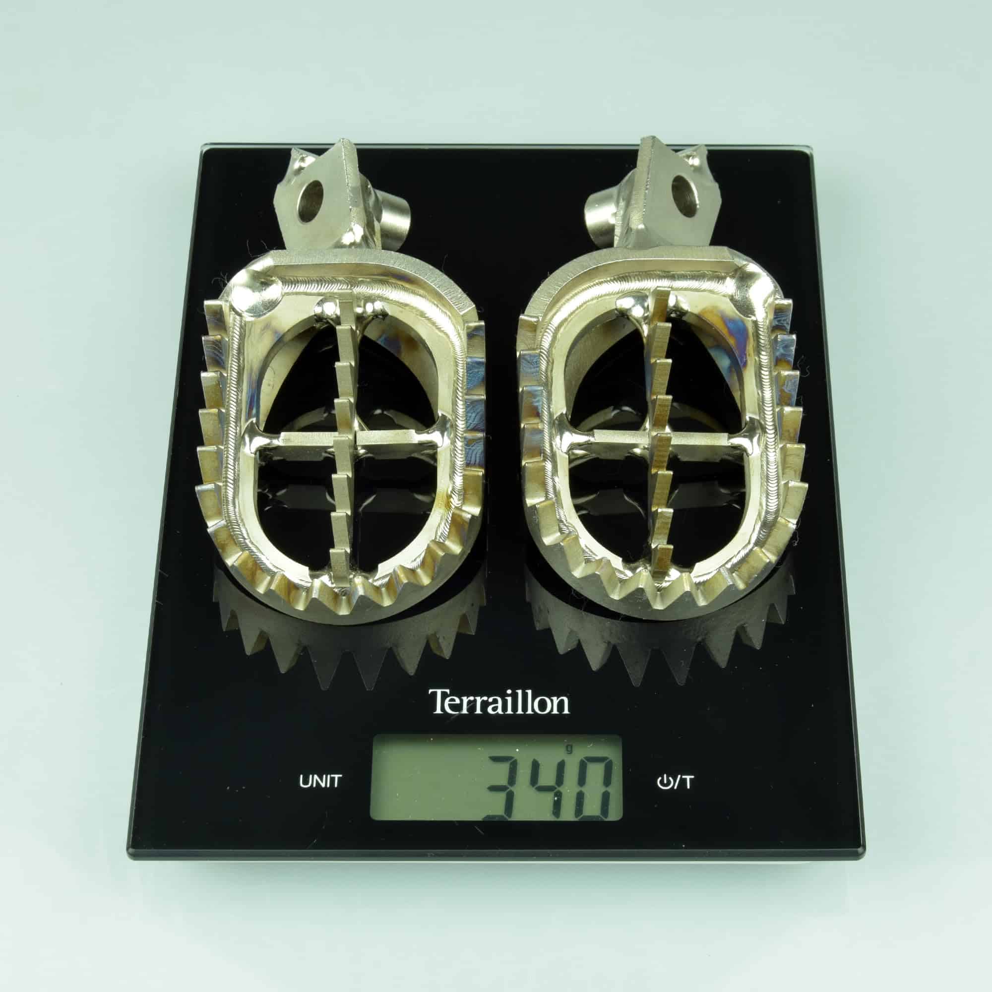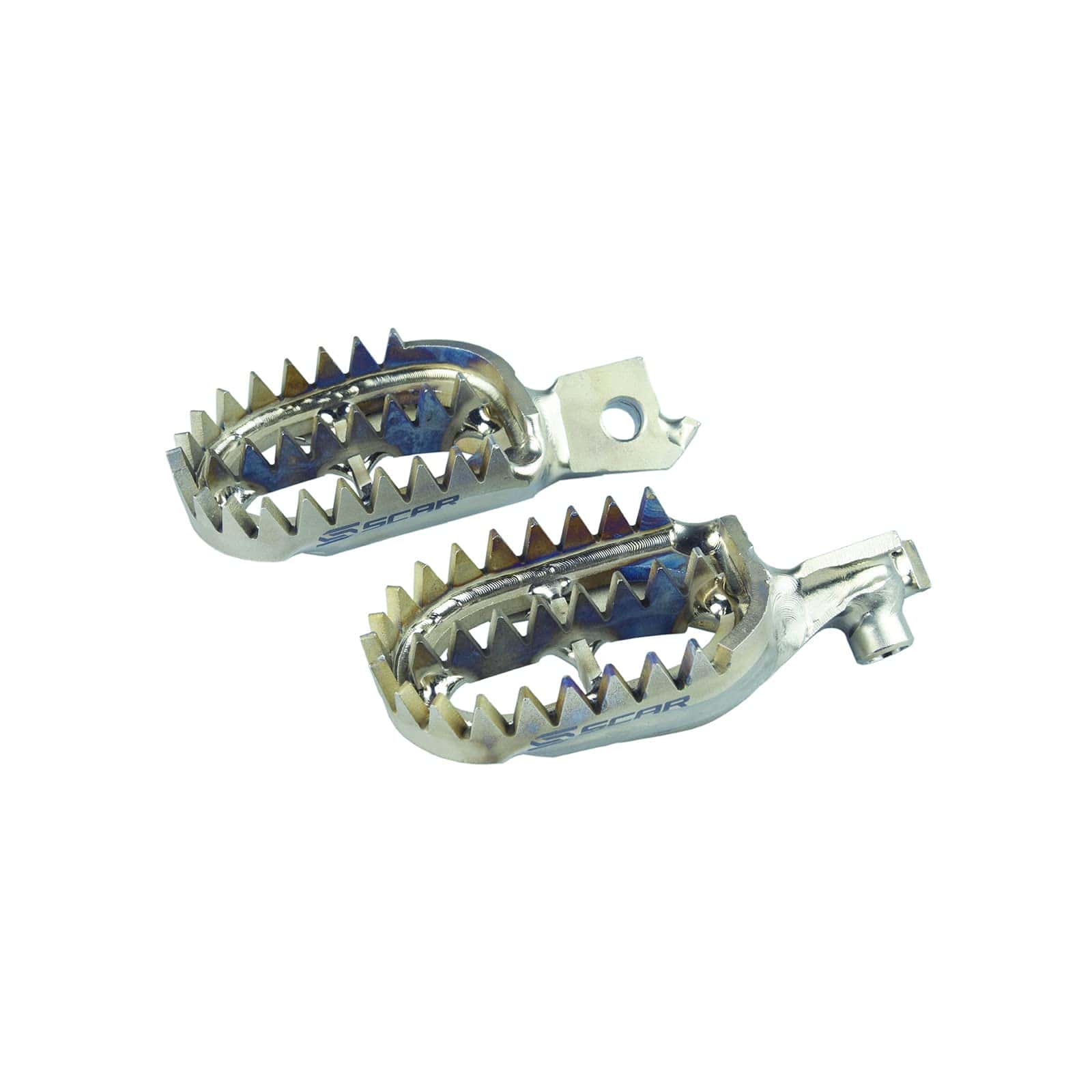 Reemplace sus reposapiés originales con estos reposapiés de titanio de alta calidad de SCAR para una mayor durabilidad y control. Fabricados con titanio de grado aeroespacial 5 Ti-6AL-4V y con una soldadura resistente, estos reposapiés son 10 mm más anchos que los OEM para una plataforma de apoyo más estable. Utilizado por equipos de fábrica como HEP Motorsports Suzuki, estos reposapiés ofrecen un rendimiento de primer nivel para su SUZUKI RMZ o RMXZ. Actualice su experiencia de conducción con estos reposapiés de titanio SCAR ahora.