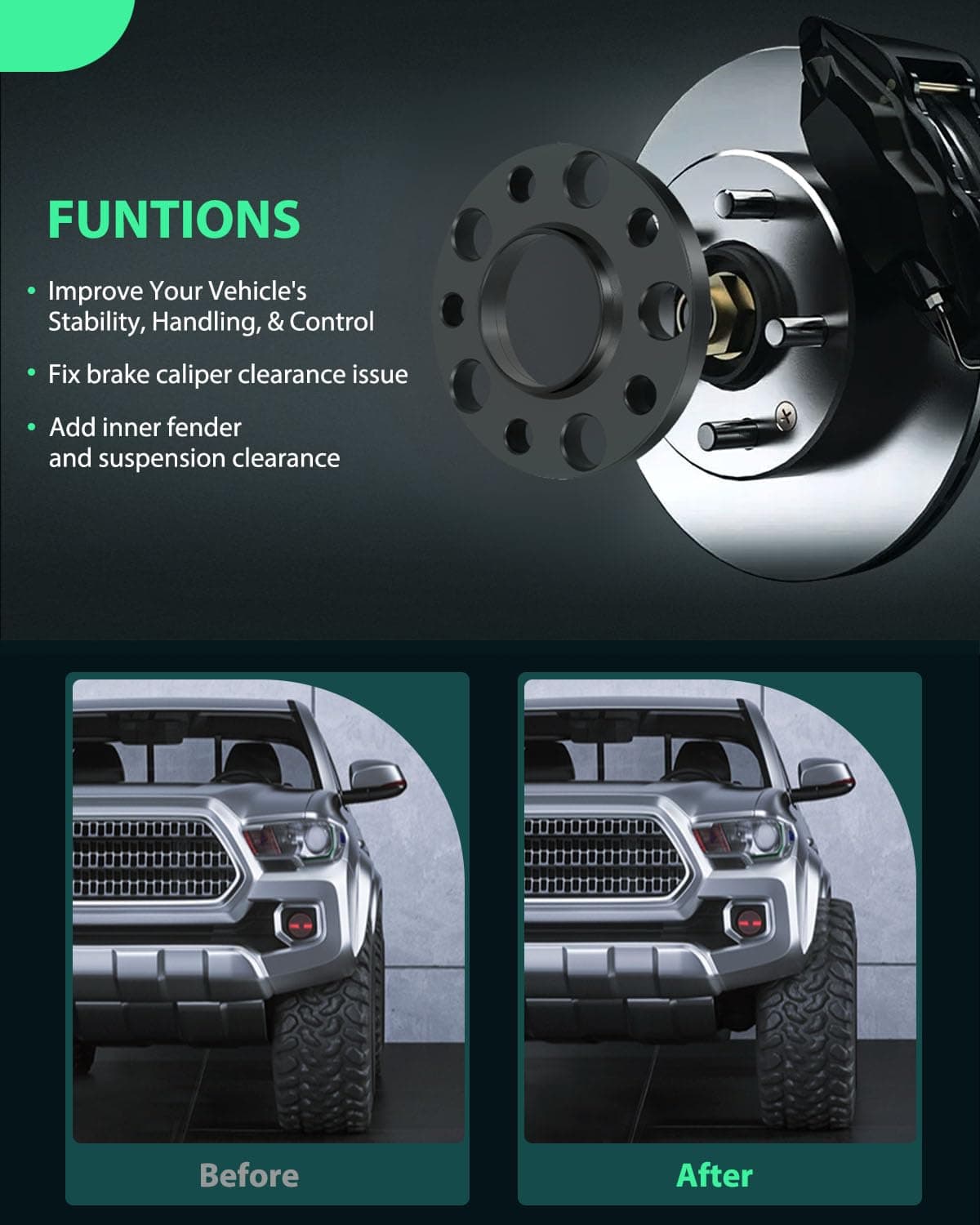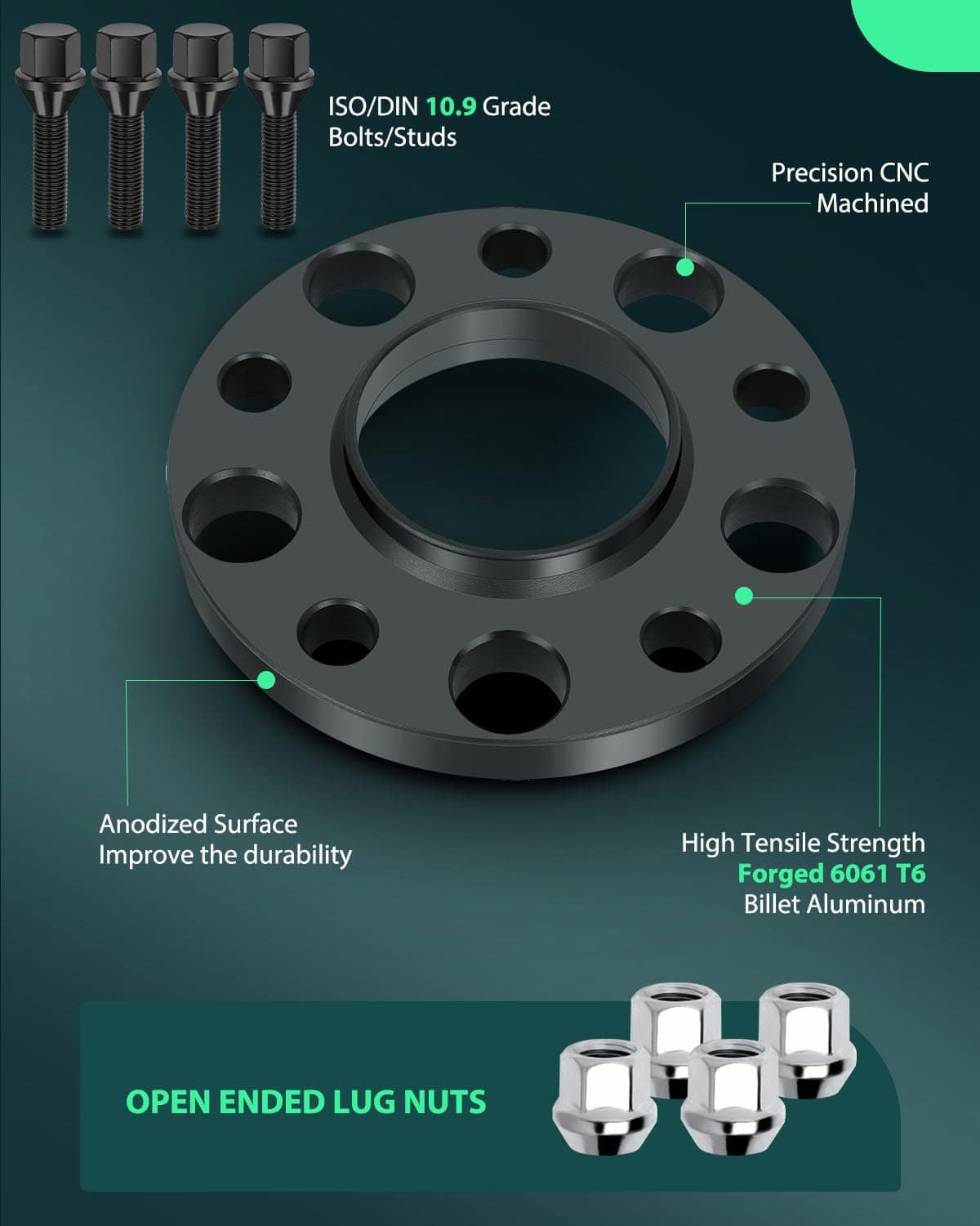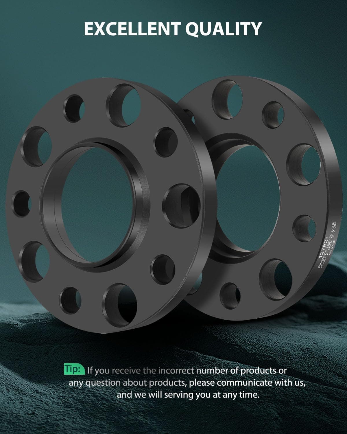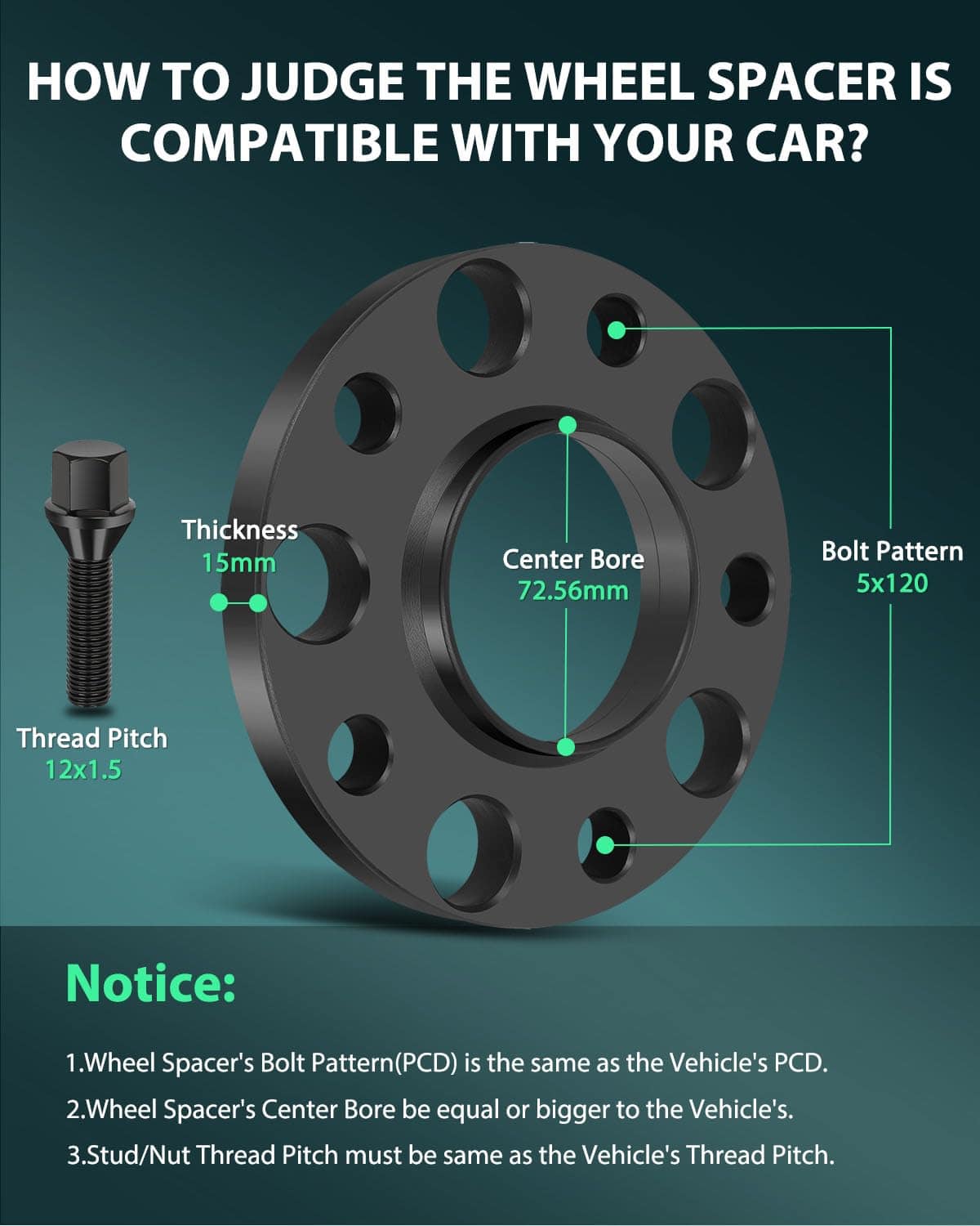 1. Juego de separadores de rueda de 5 pernos: Especificaciones de los separadores de rueda; Grosor: 15 mm; Patrón de perno del vehículo: 5×120; Patrón de perno de la rueda: 5×120; Centro de llanta: 72 mm; Paso de rosca: 12×1.5. 2. Adaptadores de separadores de rueda COMPATIBILIDADES: Los separadores de rueda de 15 mm 5×120 son aptos para 330Ci 2001-2006. 3. Separadores de rueda FUERTES Y DURADEROS: Los separadores de rueda están hechos con aluminio forjado en caliente de grado aeronáutico con una relación de resistencia a peso que supera al acero. Mientras tanto, los pernos ISO/DIN 10.9 forjados, tratados térmicamente y endurecidos, brindan resistencia. Bordes estriados rectos para una mejor agarre durante la instalación. 4. BENEFICIOS de los Separadores de rueda de 20 mm: Los separadores de rueda permiten una colocación exterior mayor de las llantas para aumentar el ancho de la vía de su vehículo para un aspecto agresivo que reduce la brecha entre el neumático y el guardabarros, y una mayor mejora en la capacidad de conducción y una estabilidad superior. 5. FÁCIL INSTALACIÓN: Ingeniería de precisión y modelo específico para un ajuste y equilibrio perfectos de la rueda. NOTA: Es necesario que vuelva a verificar la compatibilidad de su vehículo ANTES de comprar.