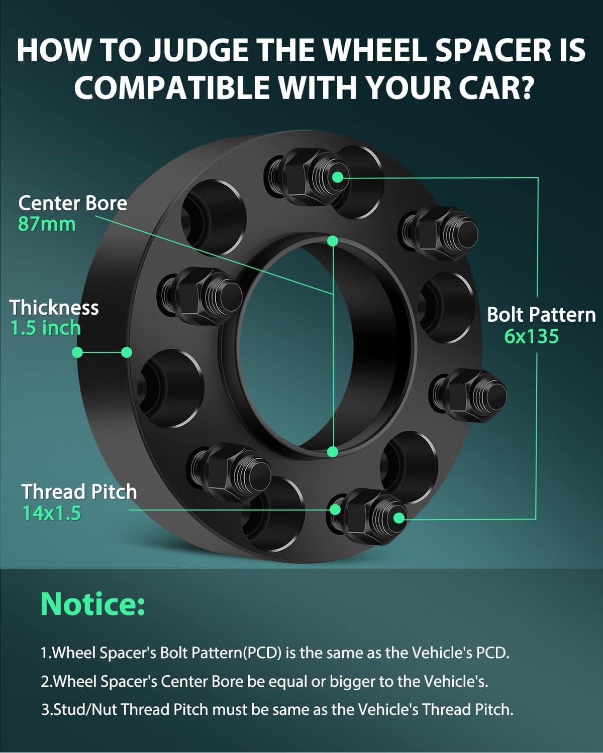 Compatible con las ruedas Adaptador Espaciadores de 6 agujeros 1,5 pulgadas de espesor, estas espaciadores de ruedas SCITOO proporcionarán un offset de 1,25 para las ruedas de fábrica. Las espaciadores de rueda no están diseñadas para ruedas más anchas que 8 pulgadas o ruedas de mercado secundario con menos de 4 pulgadas de retroceso. Se vende en pares. Mantiene el patrón de pernos original, y actúa solo como un espaciador de offset – de 6x135mm a 6x135mm. (Espesor de 1.5 pulgadas, patrón de perno de vehículo 6×135, patrón de perno de la rueda 6×135, agujero central de 87mm, espárragos de 14×1.5). Hechas con aleación de aluminio forjado en caliente de calidad aeronáutica para una relación de resistencia y peso que supera al acero. Mientras tanto, los espárragos ISO/DIN 10.9 forjados, tratados térmicamente y endurecidos brindan resistencia. Bordes dentados rectos para un mejor agarre durante la instalación. Fácil instalación, Ingeniería de precisión y Específico para el Modelo para un Ajuste Perfecto y Equilibrio de la Rueda. El paquete contiene: 2 piezas de espaciadores de rueda de 6×135 + 12 pernos de rueda.