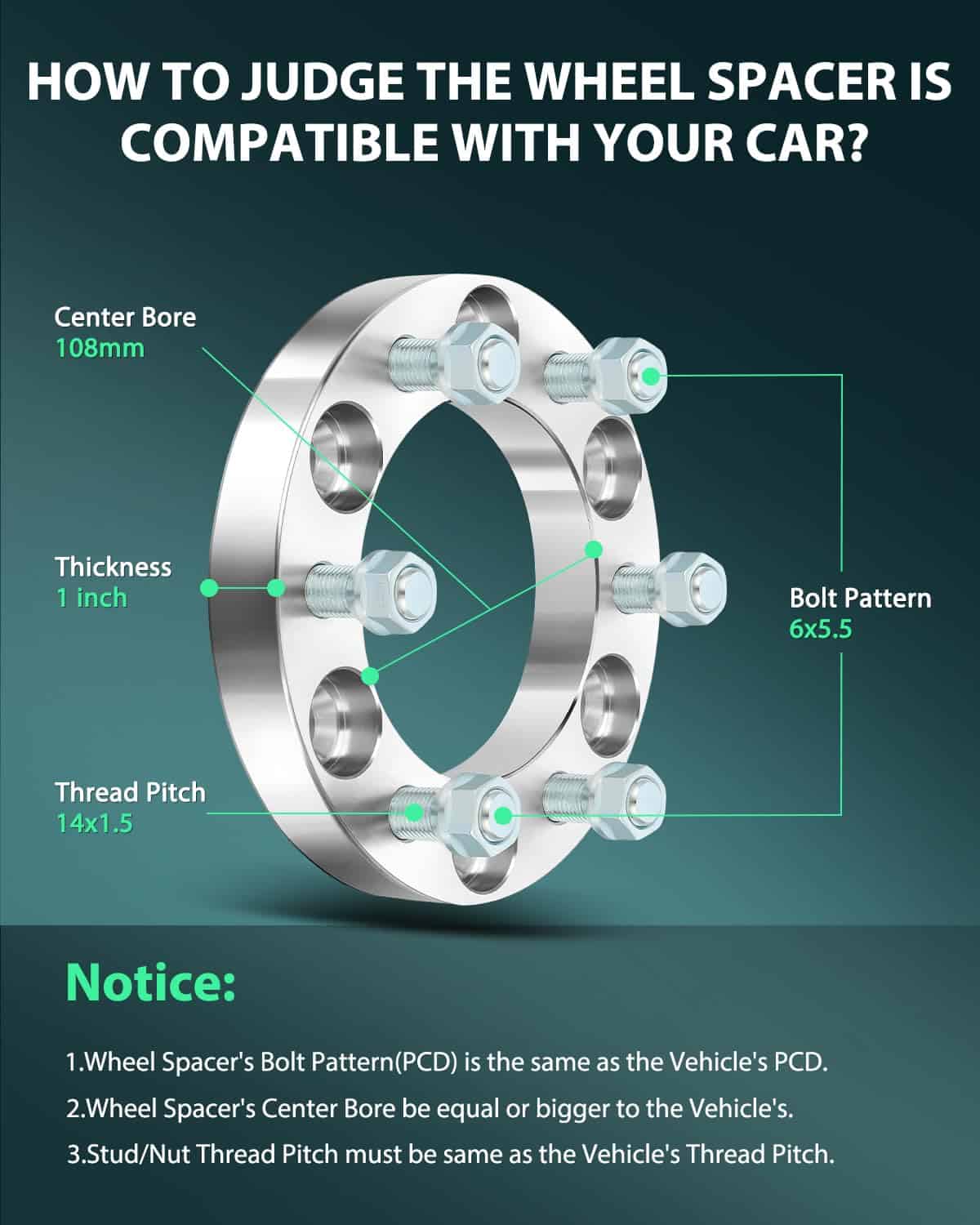2. SEPARADORES DE RUEDA 6×5.5: Los adaptadores de separadores de rueda SCITOO proporcionarán un desplazamiento de 1 pulgada para ruedas de fábrica. El separador de rueda no está destinado para ruedas más anchas de 8 o ruedas de mercado secundario con menos de 4 de retroceso. Se venden en pares. Mantienen el patrón de pernos de fábrica, y actúan solo como separador de offset – vehículo de 6×5.5 o 6×139.7 mm (1 pulgada de grosor, patrón de pernos del vehículo de 6×5.5 o 6×139.7 mm, patrón de pernos de rueda de 6×5.5 o 6×139.7 mm, centro de buje de 108 mm, pernos de 14×1.5).