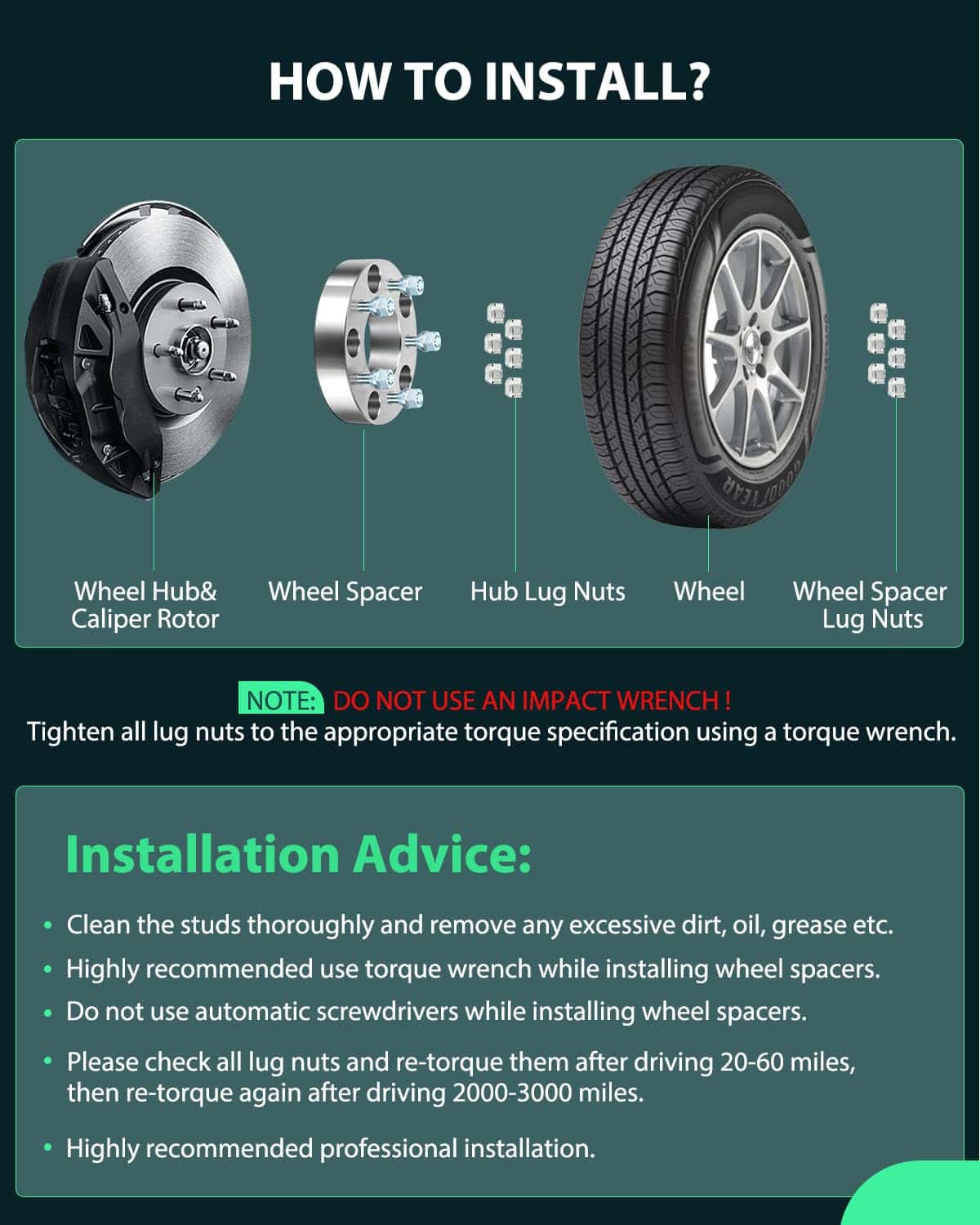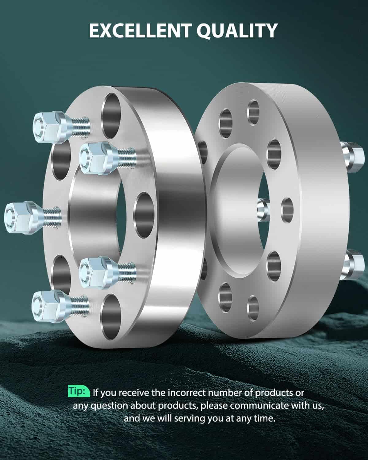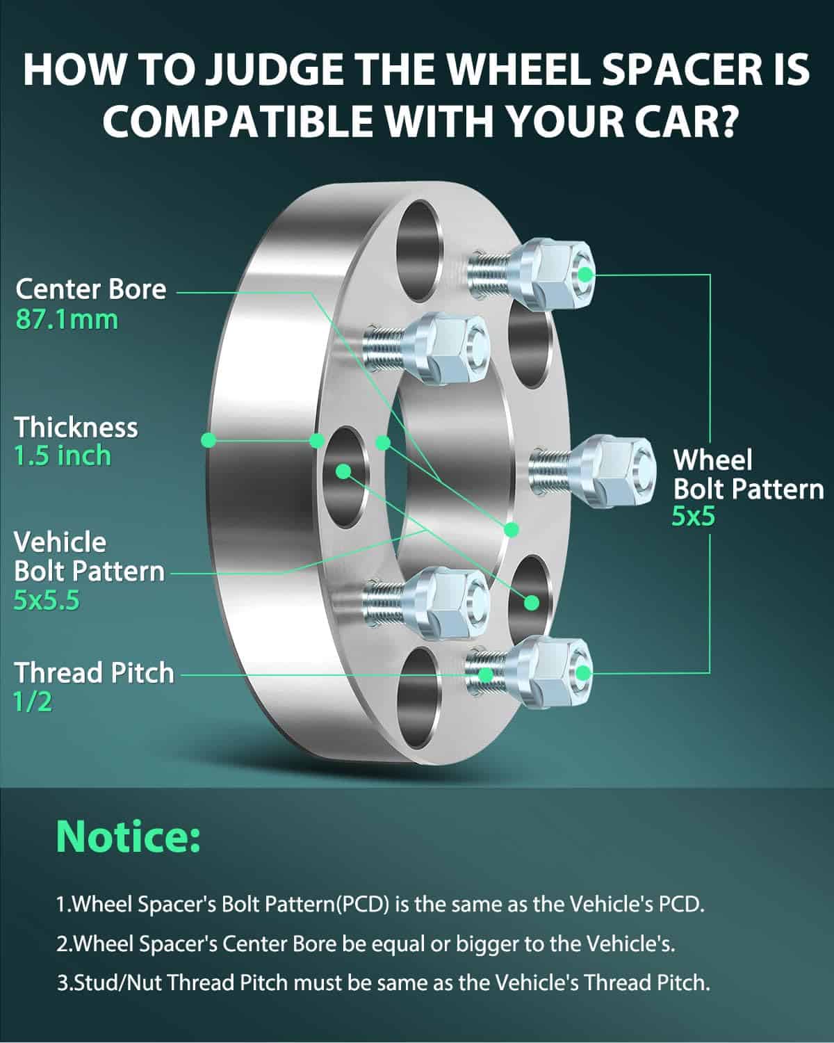 1. 5×5.5 Wheel Spacers Kits: Especificaciones; Espesor: 1.5 pulgadas; Patrón de Perno del Vehículo: 5×5.5; Patrón de Perno de Rueda: 5×5; Buje central: 87.1mm; Paso de Rosca: 1/2 . Paquete contiene: 4Pcs Separadores de rueda plateados sin centrico.