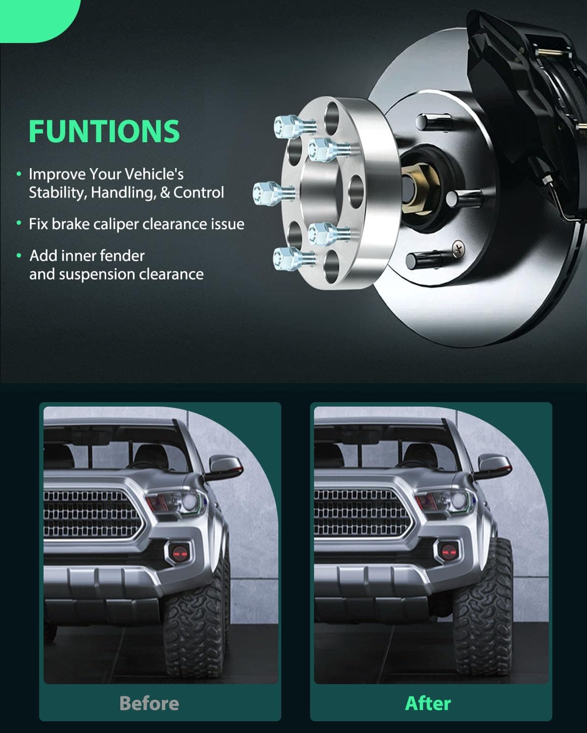 4. Funciones de los Separadores de Rueda: Las piezas de los Separadores de Rueda permiten una colocación más exterior de las ruedas para aumentar el ancho de la pista de su vehículo para un aspecto agresivo que reduce la brecha entre el neumático y el guardabarros, y una mayor mejora en la estabilidad y manejo.