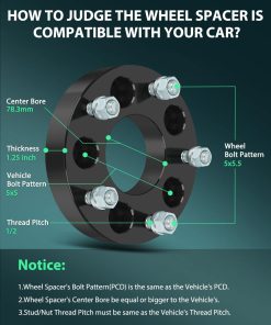 SCITOO 4Pcs Adaptadores de Rueda 1.25 pulgadas 5×5 a 5×5.5 Orificio 78.3mm Pernos 1/2 Espaciadores de Rueda 5 Lug Adaptadores Ajuste para Ford Thunderbird Chevrolet Astro Jeep Grand Cherokee Jeep. Los Adaptadores de Rueda de 5×5 se ajustan a varios modelos de vehículos, incluidos Ford Thunderbird, Chevrolet Astro, Jeep Grand Cherokee, Jeep Wrangler, Jeep Commander, GMC Safari, Buick LeSabre, Buick Riviera, Cadillac DeVille y más. El kit incluye 4 piezas de Adaptadores de Rueda con un grosor de 1.25 pulgadas, con Patrón de Perno del Vehículo de 5×5 y Patrón de Perno de la Rueda de 5×5.5, perfecto para aumentar la anchura de la pista de su vehículo para una apariencia agresiva. Hechos con aluminio forjado y pernos tratados térmicamente para una resistencia superior. Diseñado para una fácil instalación y un equilibrio de ruedas preciso. Suministrado por SCITOO Auto, estos adaptadores son compatibles con la mayoría de los autos, SUV, camionetas, camiones y remolques.
