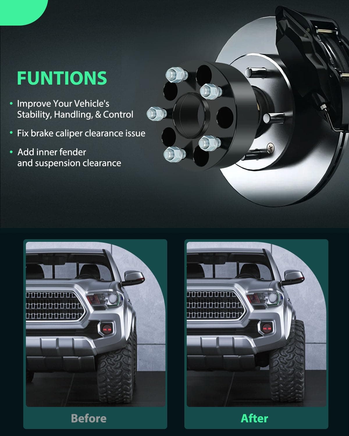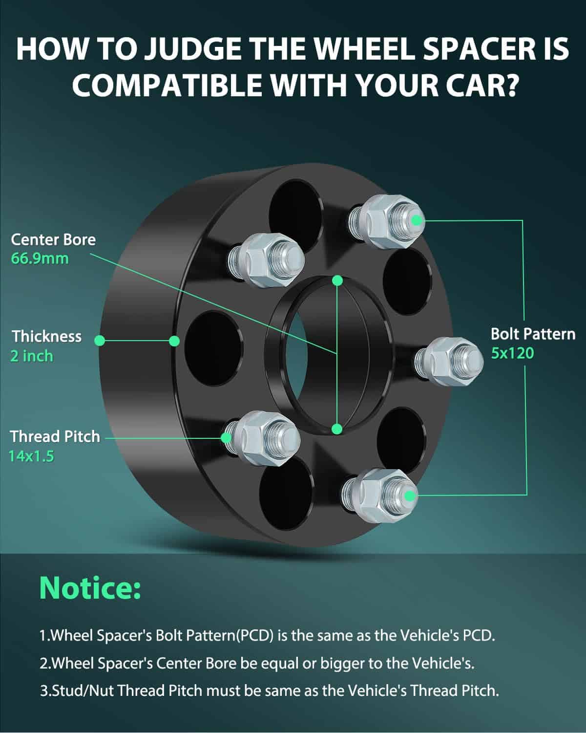 Los Separadores de Rueda de 2 pulgadas SCITOO vienen en un kit de 4 piezas con especificaciones de espesor de 2 pulgadas, patrón de pernos del vehículo de 5×120, patrón de pernos de la rueda de 5×120, buje central de 66.9mm, y paso de rosca de 14×1.5. Estos espaciadores de rueda están hechos con aluminio de calidad aeroespacial forjado en caliente, con una resistencia que excede al acero. Los pernos ISO/DIN 10.9 forjados, tratados térmicamente y endurecidos, ofrecen una gran resistencia. Los bordes dentados rectos mejoran el agarre durante la instalación. Los beneficios de los espaciadores de rueda de 2 pulgadas incluyen una mayor colocación de las ruedas hacia afuera para aumentar el ancho de la huella de su vehículo, para un aspecto agresivo que reduce la brecha entre el neumático y el guardabarros, y para una mejoría en la estabilidad en curvas y mayor estabilidad. La instalación es fácil y precisa, específica para el modelo y equilibrio de la rueda perfecta. Nota: Es necesario que verifique la compatibilidad con su vehículo ANTES de comprar.