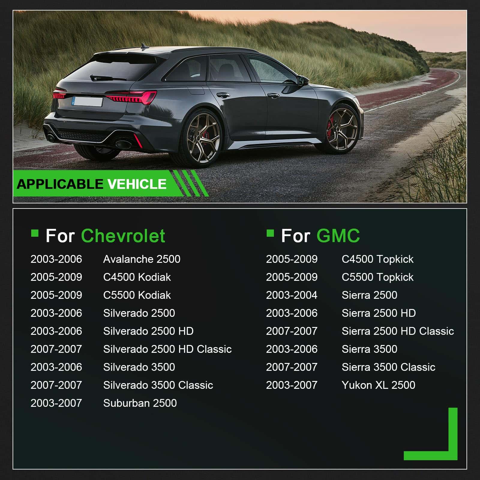 1. Ajuste para Chevrolet Avalanche 2500 2003-2006, para Chevrolet Silverado 2500 2003-2006, para Chevrolet Silverado 2500 HD 2003-2006, para Chevrolet Silverado 2500 HD Classic 2007, para Chevrolet Silverado 3500 2003-2006, para Chevrolet Silverado 3500 Classic 2007, para Chevrolet Suburban 2500 2003-2007, para GMC Sierra 2500 2003 2004, para GMC Sierra 2500 HD 2003-2006, para GMC Sierra 2500 HD Classic 2007, para GMC Sierra 3500 2003-2006, para GMC Sierra 3500 Classic 2007, para GMC Yukon XL 2500 2003-2007.