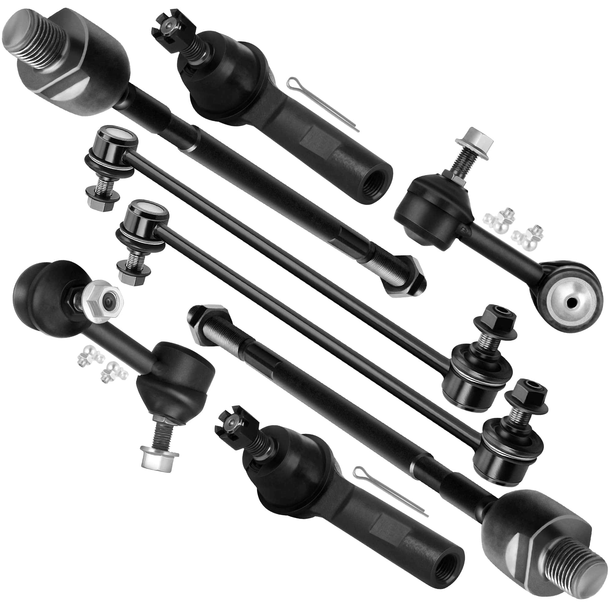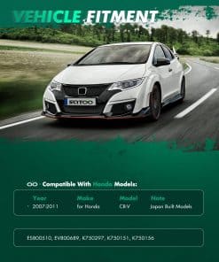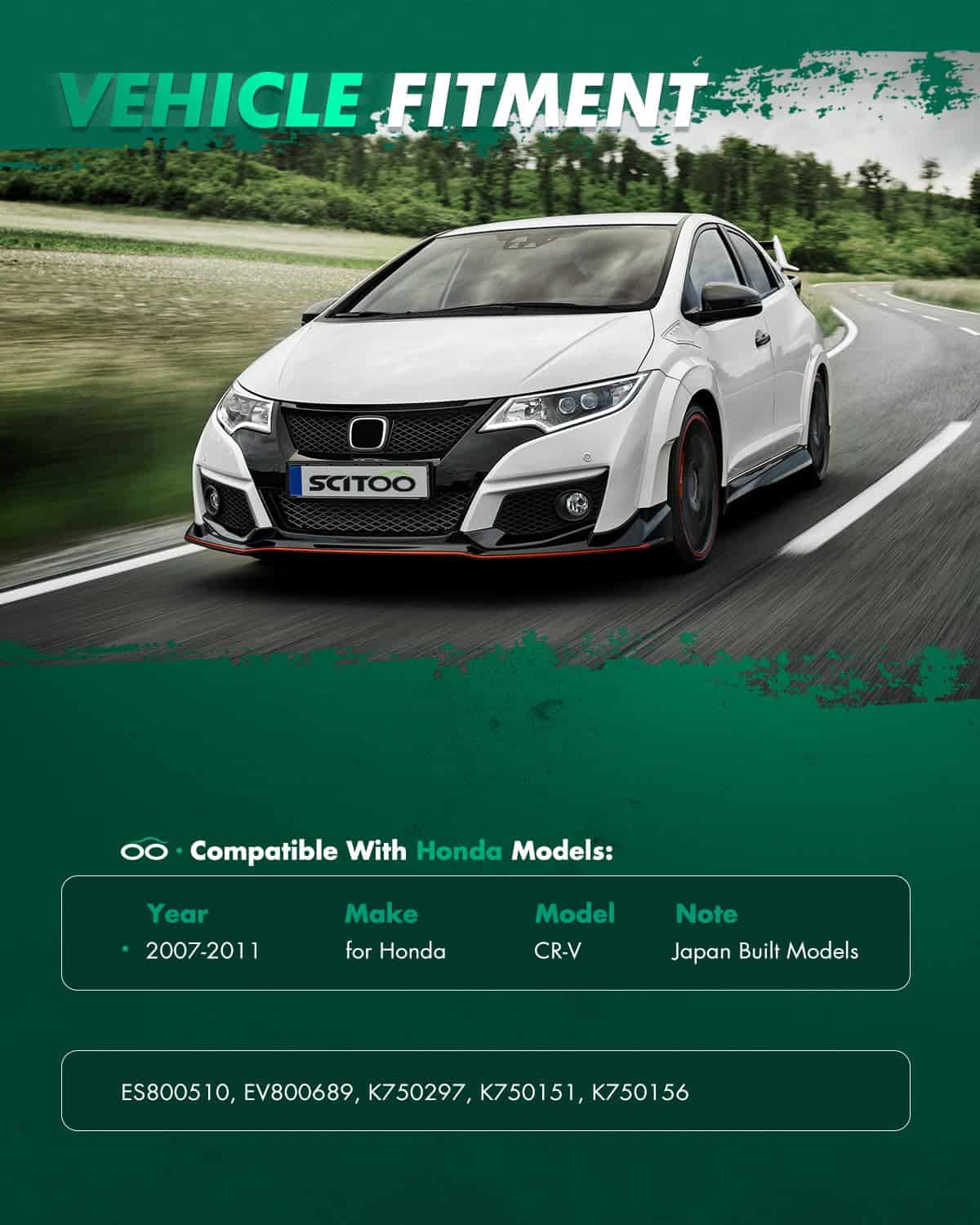 Front End Suspension Kit Apto para Honda CR-V 2007 2008 2009 2010 2011 (Modelos construidos en Japón (1er dígito VIN J)). Incluye piezas de reemplazo de suspensión 2 x K750297 Enlaces de extremo de la barra estabilizadora delantera, 1 x K750156 Enlace de extremo de la barra estabilizadora trasera – Lado del conductor, 1 x K750151 Enlace de extremo de la barra estabilizadora trasera – Lado del pasajero, 2 x EV800689 Extremos de la barra de dirección interna delantera, 2 x ES800510 Extremos de la barra de dirección exterior delantera. Incluye números de parte alternativos/OEM ES800510, 53540SWAA01; EV800689, 53010SWAA01; K750151, 52320SWAA01; K750156, 52321SWAA01; K750297, 51320STKA01, 51320T0AA01. Guía del comprador El kit de suspensión completo generalmente incluye brazos de control, brazo de dirección, brazo de mando, extremos de la barra de dirección, enlaces de barra estabilizadora y juntas esféricas, etc. Todas nuestras piezas de suspensión de reemplazo vienen preengrasadas para reducir la fricción y prolongar la vida útil, y no requerirán trabajo adicional. Si tiene algún problema durante la instalación o uso, le proporcionaremos una guía técnica profesional. Nota SCITOO Auto proporciona soporte de reemplazo de 1 año, suministramos kits de suspensión de calidad premium para la mayoría de los coches, SUV, camiones y remolques. Por favor, seleccione su vehículo (año/marca/modelo/recorte) en el Buscador de piezas para confirmar la compatibilidad, o vea los vehículos compatibles en la descripción