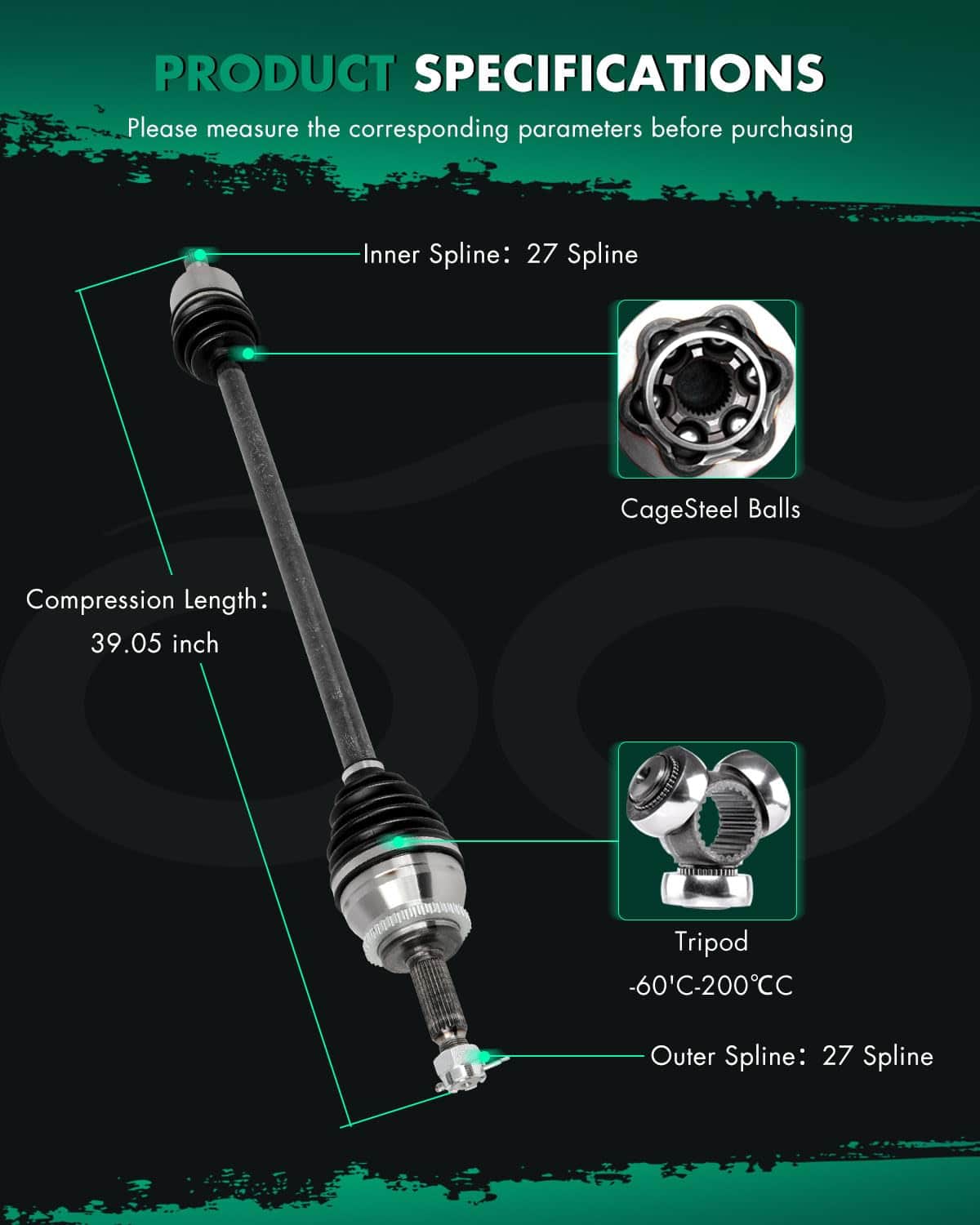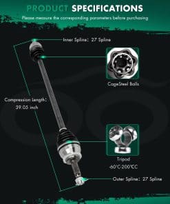Posición: Lado derecho del pasajero delantero; Recuento de estrías interiores: 27 estrías; Recuento de estrías exteriores: 27 estrías; Longitud comprimida: 991 mm; Anillo ABS incluido: Sí; Recuento de dientes del anillo ABS: 43T; Tuerca del eje incluida: Sí. Eje de árbol de transmisión CV de alta calidad hecho de neopreno de calidad y grasa de molibdeno asegura que los rodamientos de rótula queden lubricados, proceso de conducción más estable, ayudando a extender la vida útil del eje de árbol de transmisión CV. Nota: SCITOO Auto suministra ensamblaje de eje CV para la mayoría de los autos, Seleccione su vehículo (año/marca/modelo/acabado) en la esquina superior izquierda de la página para confirmar la compatibilidad o consulte la información del vehículo en la descripción.