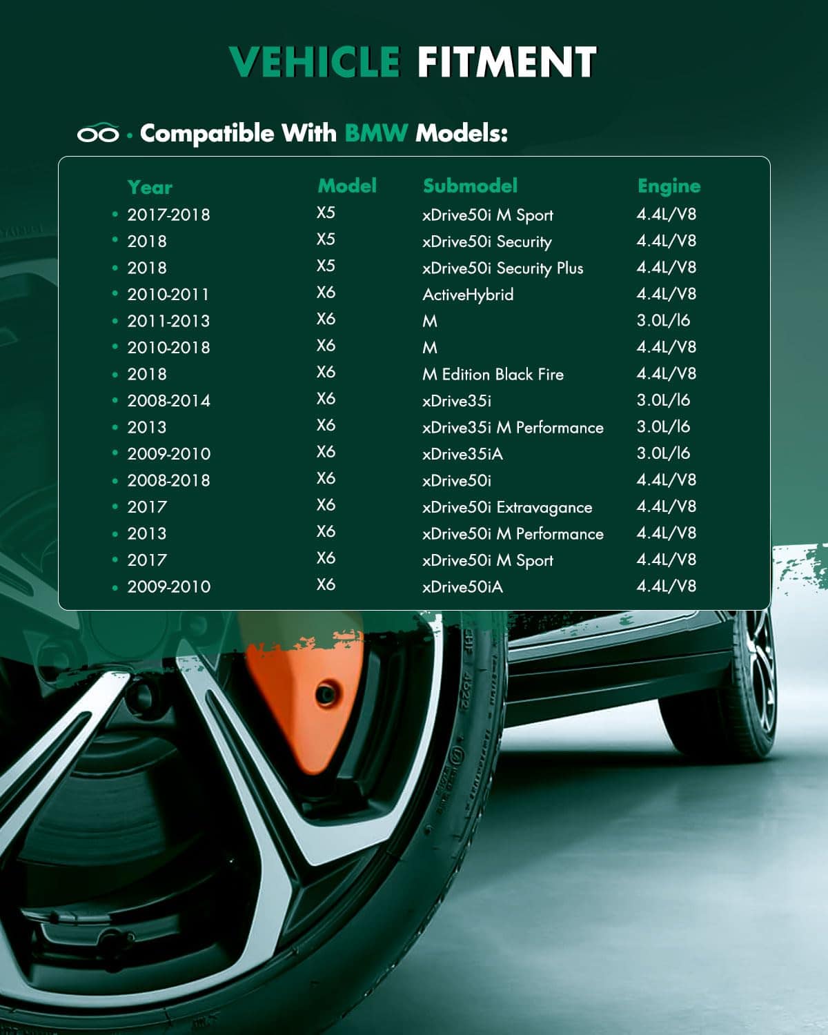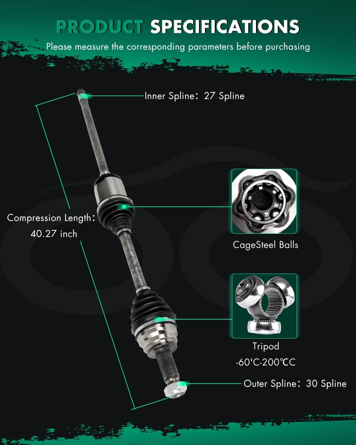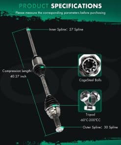 1. Compatible con: BMW X5 3.0L 2007-2013, X5 4.4L 2010-2018, X5 4.8L 2007-2010, X6 3.0L 2008-2014, X6 4.4L 2008-2018. 2. Número OE de referencia: 31607545126, 31608631750, 66-9319, 60-9319, 669319, 609319. 3. Especificaciones: Posición: Delantero derecho del lado del pasajero; Recuento interno de estrías: 27 estrías; Recuento outer de estrías: 30 estrías; Longitud comprimida: 1022 mm; Anillo ABS incluido: No; Tuerca del eje incluida: Sí. 4. Características de la bota: Solo utilizamos botas de neopreno de calidad para nuestros ejes, resistencia alta al estiramiento sin romperse.