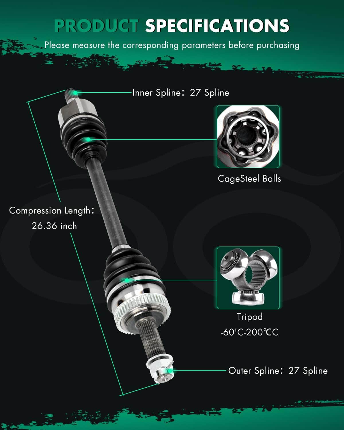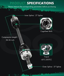 3. Especificaciones: Posición: lado izquierdo del conductor; Cuenta de estrias interiores: 27 estrias; Cuenta de estrias exteriores: 27 estrias; Longitud comprimida: 669 mm; Anillo ABS incluido: Sí; Cantidad de dientes del anillo ABS: 48T; Tuerca del eje incluida: Sí.