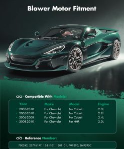 1. Compatibilidad: Motor del soplador de aire acondicionado para Chevrolet Cobalt l4 2.0L 2005-2010, para Chevrolet Cobalt l4 2.2L 2005-2010, para Chevrolet Cobalt l4 2.4L 2006-2008, para Chevrolet HHR l4 2.0L 2008-2010, para Chevrolet HHR l4 2.2L 2006-2011, para Chevrolet HHR l4 2.4L 2006-2011, para Pontiac G5 l4 2.2L 2007-2009, para Pontiac G5 l4 2.4L 2007-2008.
