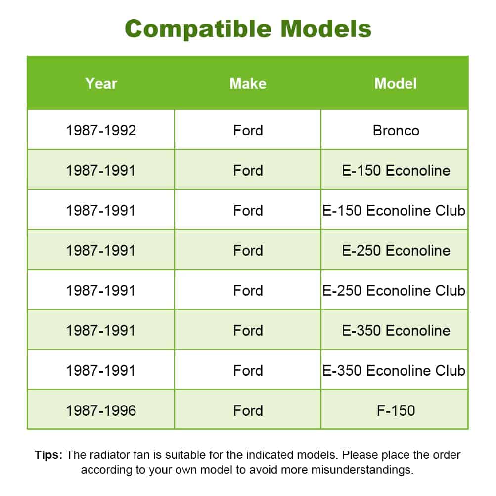 1. Modelos Aplicables: El embrague del ventilador se ajusta para 1987 1992 para Bronco, 1987-1991 para E-150 para Econoline, 87 91 para E-150 para Econoline para Club para Wagon, 87-91 para E-250 para Econoline para Club para Wagon, 87 91 para E-350 para Econoline, 87-91 para E-350 para Econoline para Club para Wagon, 87 96 F-150 F-250 F-350.