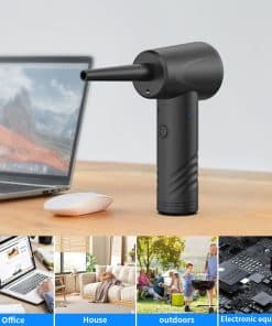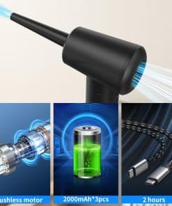 Este Soplador de Aire comprimido viene con más de suficiente presión de soplado, incluye varios accesorios que lo hacen ideal para el hogar, coche, computadora, cualquier cosa que necesite ser soplada para eliminar la suciedad y el polvo. Tiene una variedad de boquillas y se puede utilizar para inflar colchones de aire, juguetes de piscina, etc. La batería es recargable e incluye el cable USB, por lo que no tendrá que lidiar con la sustitución de baterías. Ahorrará mucho dinero al no tener que comprar latas de aire comprimido. No es muy grande, fácil de guardar (viene con un bolso de tela suave para guardarlo). Tiene dos ajustes de potencia. El LED ayuda a iluminar áreas oscuras en el equipo. Es lo suficientemente fuerte como para usarse como soplador en su tienda de campaña cuando acampa. Detalles Técnicos: Capacidad de la batería: 6000mhA, Tiempo de carga: 3-4 horas, Alimentación: DC5V, Velocidad nominal: 51,000 (r/min), Potencia de entrada nominal: 65 (W), Dimensiones del paquete: 8.2 x 4.92 x 3.85 pulgadas, Material: ABS, Peso del artículo: 0.88 libras. Paquete incluido: 1 Soplador de Aire, 5 Boquillas, 1 Cable USB, 1 Bolsa de tela con cordón, 1 Manual del usuario