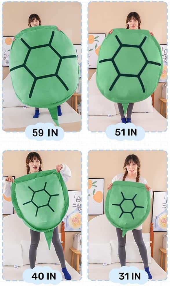 3. Para Todas las Edades Esta almohada de tortuga vestible que diseñamos en cuatro tamaños: 32 pulgadas/80cm; 40 pulgadas/100cm; 51 pulgadas/130cm 59 pulgadas/150cm, los niños y adultos pueden usarla fácilmente.