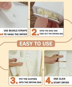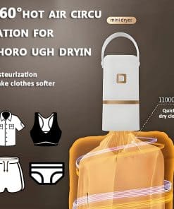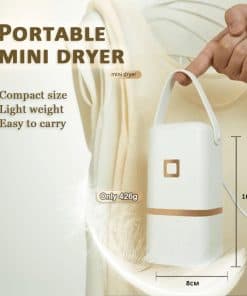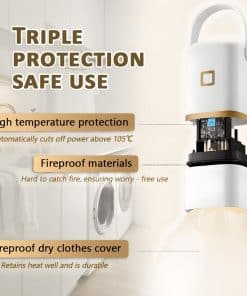 Esta secadora de ropa mini portátil es una solución conveniente para secar ropa ligera, ropa interior y ropa de bebé en cualquier momento y lugar. Su tamaño compacto y ligereza la hacen perfecta para llevar en viajes, usar en apartamentos pequeños, RVs y en lugares donde el espacio para la lavandería es limitado. La tecnología de secado por circulación de aire caliente asegura una rápida penetración del aire caliente desde los puños hasta el cuello de la prenda. Además, cuenta con triple protección contra incendios, incluida una función de corte automático de energía cuando la temperatura excede los 105 grados Celsius. Su operación es sencilla gracias al control de un solo botón, y la funda de ropa adjunta facilita la limpieza. Sin embargo, es importante tener en cuenta que no es adecuada para prendas de gran tamaño. Si encuentras algún defecto inicial, contáctanos a través de «Historial de pedidos» – «Contactar al vendedor» para encontrar una solución rápida.