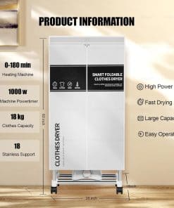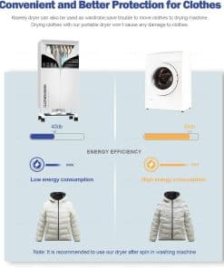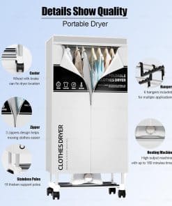 Descripción: Secadora de ropa portátil con temporizador y gran capacidad de secado. Ideal para usar en hogares y apartamentos. La secadora Kieely es resistente, con postes de metal reforzados que pueden soportar hasta 18 kg de peso. Su diseño de secado con perchas evita arrugas en la ropa y elimina olores peculiares. La máquina de secado de alto rendimiento seca la ropa más rápido que otras secadoras portátiles en el mercado. Además, consume un 30% menos de energía y produce menos ruido que las secadoras convencionales. Una opción eficiente y silenciosa para el cuidado y protección de la ropa. Servicio postventa disponible para satisfacer las necesidades del cliente. ¡Ordene ahora y disfrute de la comodidad de la secadora portátil Kieely!