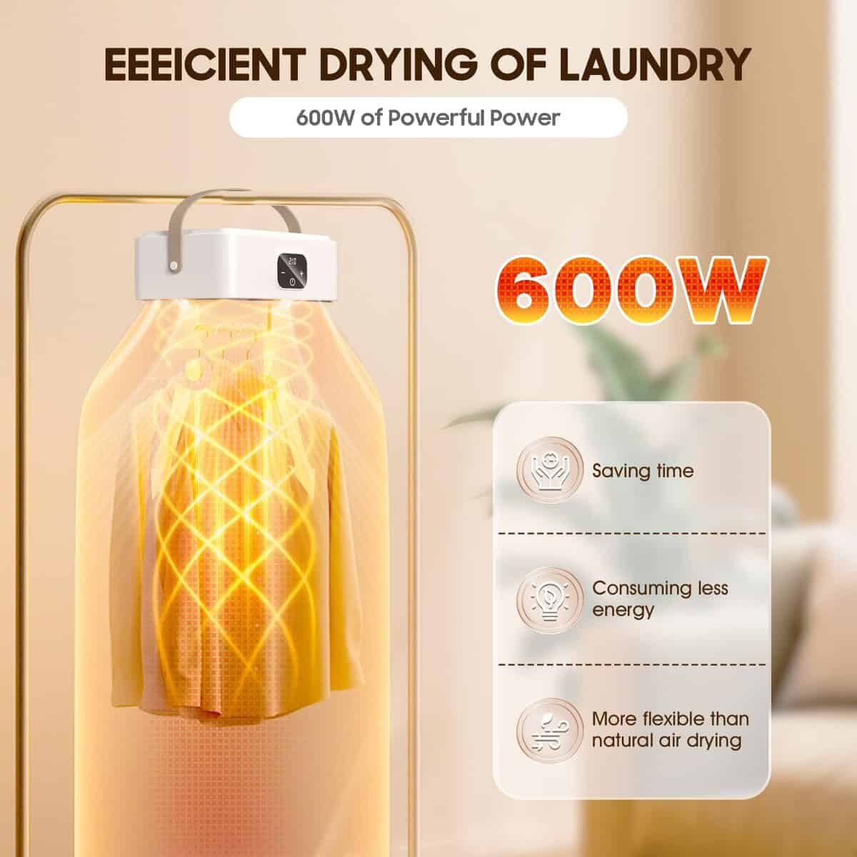 – Con una potencia de 600W, esta secadora portátil seca tu ropa rápidamente y suavemente. Al mismo tiempo, no incurre en costos elevados e integra alta eficiencia y ahorro de energía.