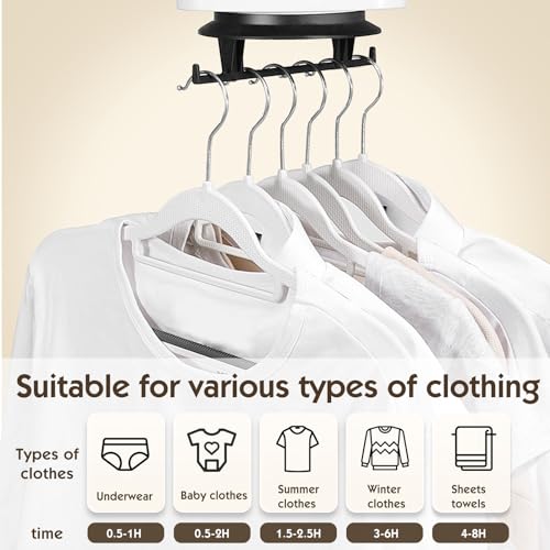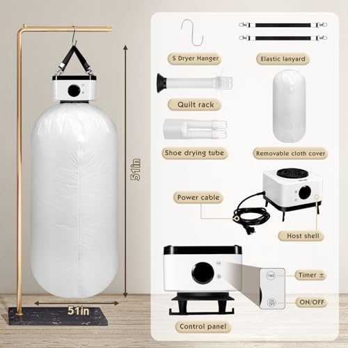 ¡Di adiós al secado en el balcón! Bueno para secar ropa Con circulación de aire caliente diseñada especialmente para un ahorro mejorado, nuestra secadora de apartamento seca de forma rápida y eficiente hasta 6 prendas a la vez. (Para secar rápidamente la ropa, recomendamos no poner más de 5.5 libras de ropa a la vez.) Bueno para secar zapatos y calentar la cama La secadora se conecta al conducto suministrado, que puede secar fácilmente los zapatos y calentar la ropa de cama. Si algunas pequeñas prendas se mojan y no desea encender la secadora solo por ese pequeño artículo, ni desea ponerlos en el tubo de calor durante un día, esto es excelente para secar esos pequeños elementos extraviados. Bueno para acampar y viajar será conveniente para aquellos casos en los que desee ir a nadar o hacer snorkel o algo así, pero no tenga suficiente tiempo para que los trajes de baño se sequen por sí solos. Esta secadora portátil puede evitar que tenga que llevar un traje de baño mojado en su bolso. Especialmente por la noche, nublado, sin balcón o simplemente no es un lugar caluroso. Función de configuración del temporizador El temporizador es de 1 hora, 2 horas , 3 horas a 4 horas (Máximo de 240 minutos). Usando un elemento calefactor cerámico PTC, se calienta rápidamente y está caliente tan pronto como se enciende. Especificaciones: Entrada nominal: 500-700w Fuente de alimentación: 110V / 50Hz Tamaño del producto: 6.69 x 6.69 x 3.74 pulgadas Dimensiones totales: 51 x 51 pulg. El paquete incluye: 1 Secadora portátil 1 Gancho de almacenamiento S 2 Tubo telescópico libre 2 Cordón elástico 1 Bolsa secadora 1 Manual