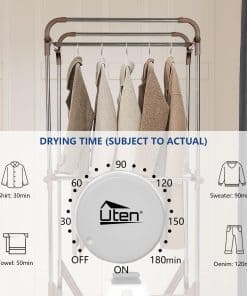 La secadora de ropa de Uten es ideal para mantener tus prendas secas y en perfectas condiciones en todo momento. Con un motor de 1500W de potencia, esta secadora seca la ropa en la mitad de tiempo que otras secadoras en el mercado. Cuenta con un diseño plegable que facilita su almacenamiento cuando no está en uso, ahorrando espacio en tu hogar o apartamento. Su capacidad de 2 niveles permite colgar una gran cantidad de ropa, incluidas prendas largas como abrigos y pantalones. El temporizador ajustable te permite controlar el tiempo de secado de forma precisa, asegurándote de que tus prendas queden perfectamente secas. Contacta con nosotros si tienes alguna pregunta sobre esta secadora de ropa de alta calidad. ¡Haz tu compra sin complicaciones y disfruta de la eficiencia y comodidad que te ofrecemos!