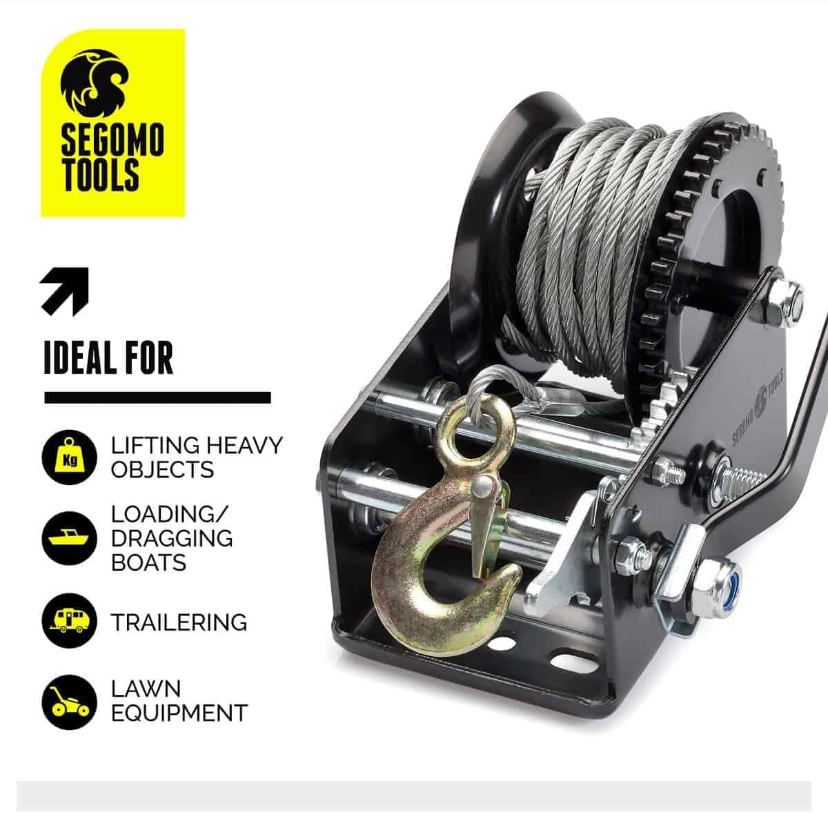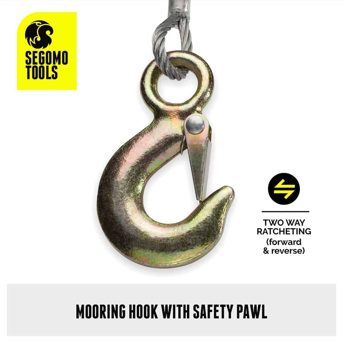 4. Puede Cargar y Descargar. El gancho de amarre está equipado con un trinquete de seguridad que permite el trinqueteo en ambas direcciones (hacia adelante y hacia atrás). Nuestro malacate de cable es ideal para cargar y arrastrar botes, equipos de jardín, remolques y levantar objetos pesados.