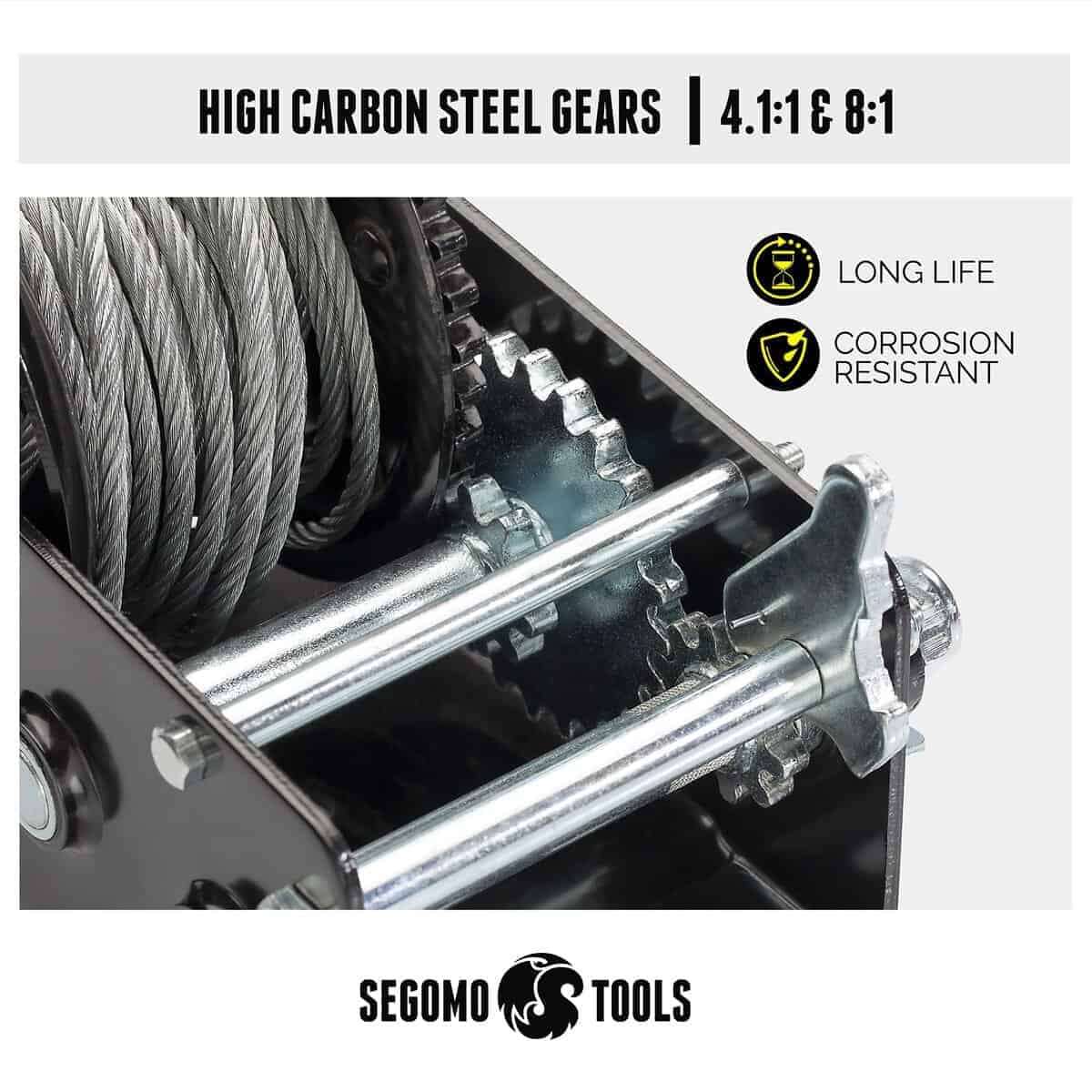 1. Durabilidad Garantizada. La construcción de acero de alta calidad y resistencia de cada malacate manual cuenta con engranajes de acero de alto carbono (4.1:1 y 8:1) para una resistencia superior a la corrosión y una vida útil más larga. Este winch de manivela manual no te fallará incluso en condiciones difíciles.