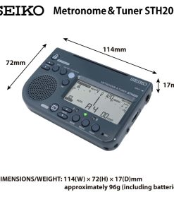 Metrónomo afinador SEIKO STH200B, ideal para músicos de bandas de viento metal. Cuenta con un sonido fuerte y estándar de clarinete, además de una práctica ranura para montar en pupitres de música. Su diseño ligero y compacto permite su uso con una sola batería AAA, garantizando la portabilidad y comodidad para su uso en cualquier lugar. Con un soporte genuino de 3 y 3 grados, este metrónomo afinador es la herramienta perfecta para mantener el tiempo y la afinación precisa durante las prácticas y presentaciones musicales.