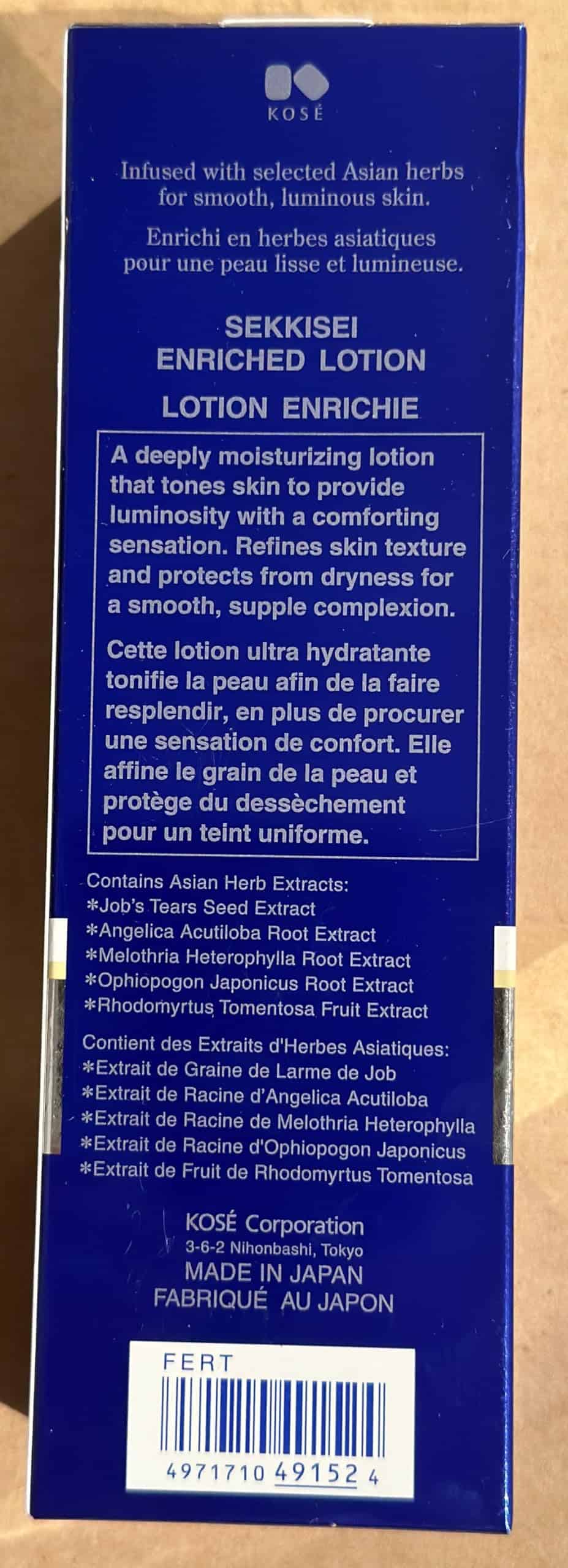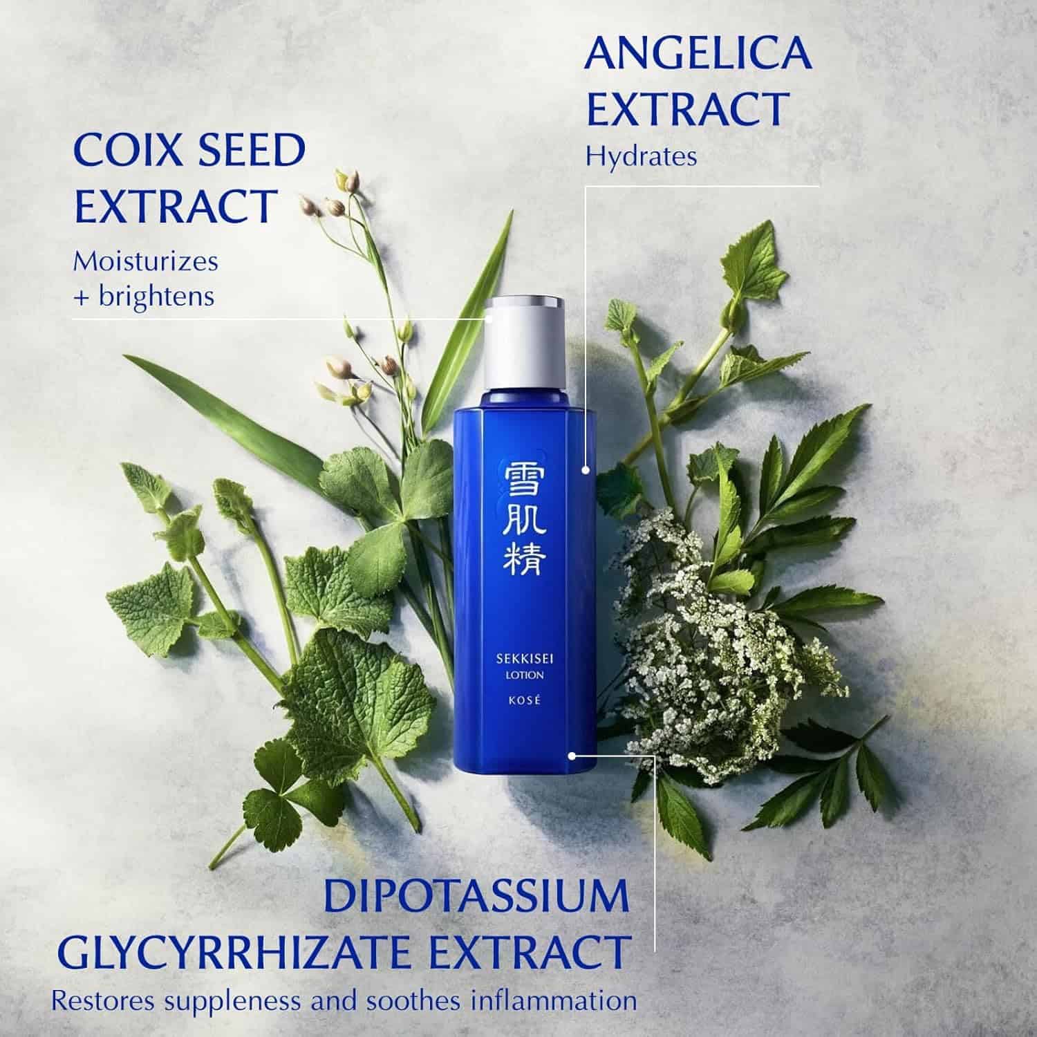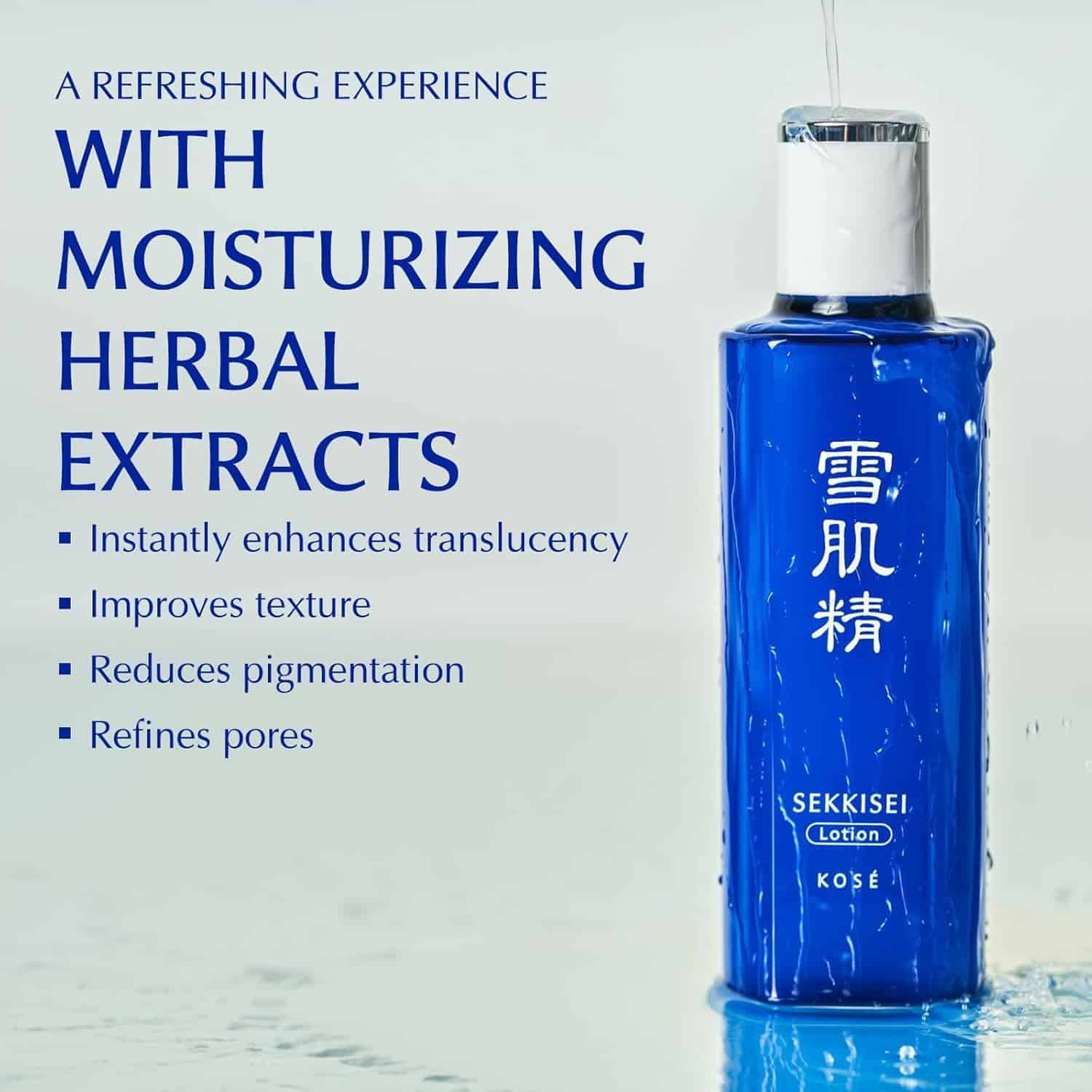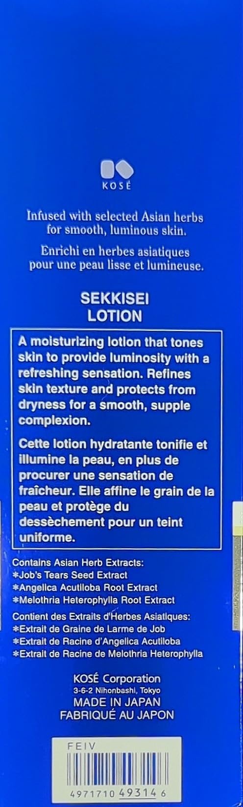 SEKKISEI Lotion es una loción hidratante que contiene extractos herbales y antioxidantes poderosos como el Extracto de Semilla de Coix Fermentada y el Extracto de Hoja de Níspero que trabajan juntos para lograr una piel radiante desde el interior, dándole a tu rostro un acabado saludable. Hecha con extracto de semilla de Coix fermentada y extractos herbales hidratantes que trabajan juntos para lograr una piel luminosa desde el interior. Esta loción facial hidratante diaria con extractos de plantas naturales mejora y rejuvenece tu piel al instante. Mejora la translucidez, refina los poros y reduce la pigmentación. KOSÉ SEKKISEI es la elección ideal para quienes desean mejorar la salud de su piel sin utilizar productos químicos agresivos u otros ingredientes potencialmente peligrosos. KOSÉ SEKKISEI: marca japonesa de cuidado de la piel infundida con antiguos remedios herbales asiáticos conocidos por sus altamente efectivos beneficios hidratantes y para la piel. Nuestras fórmulas combinan la investigación científica japonesa con ingredientes cuidadosamente seleccionados de cientos de hierbas diferentes para crear los productos de cuidado de la piel más efectivos. Cuidado de la piel confiable por millones desde 1985. Hecho en Japón.