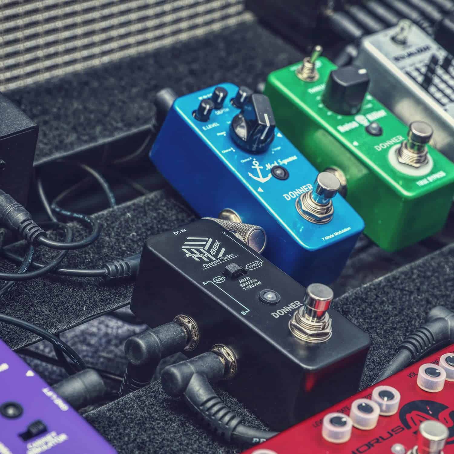 1. Selector de señal ABY Donner versátil que puede alternar una señal entrante a dos salidas separadas, aplicable para instrumentos musicales como amplificador, altavoz y pedalera.