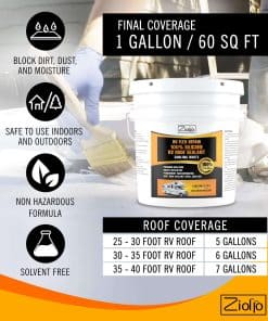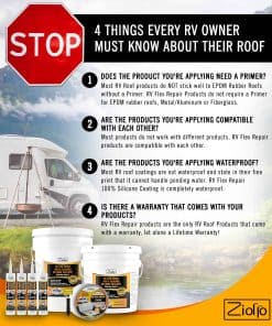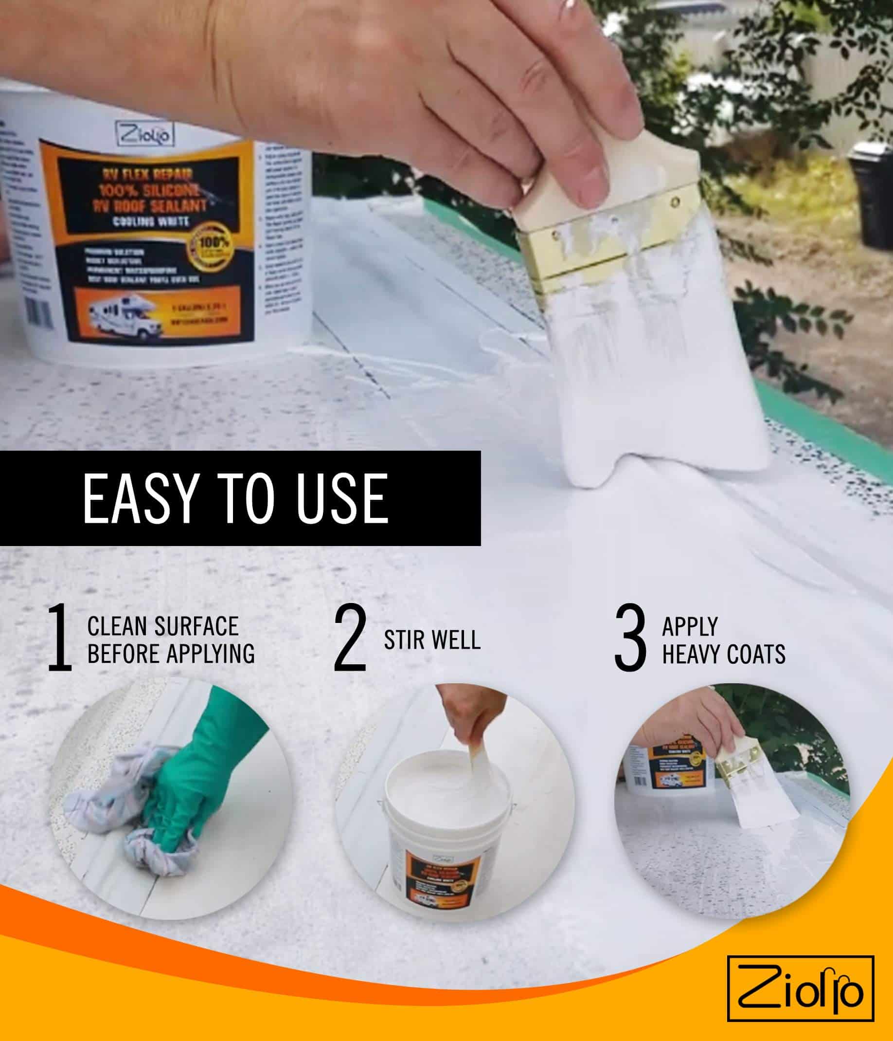 1. SELLADOR DE SILICONA PREMIUM: Con nuestra fórmula de silicona revolucionaria, el Sellador RV Flex Repair de Ziollo forma una barrera impermeable permanente para proteger el techo de tu RV. Nuestro sellador de silicona premium supera los recubrimientos estándar en el mercado y funciona en todo tipo de techos de RV.
