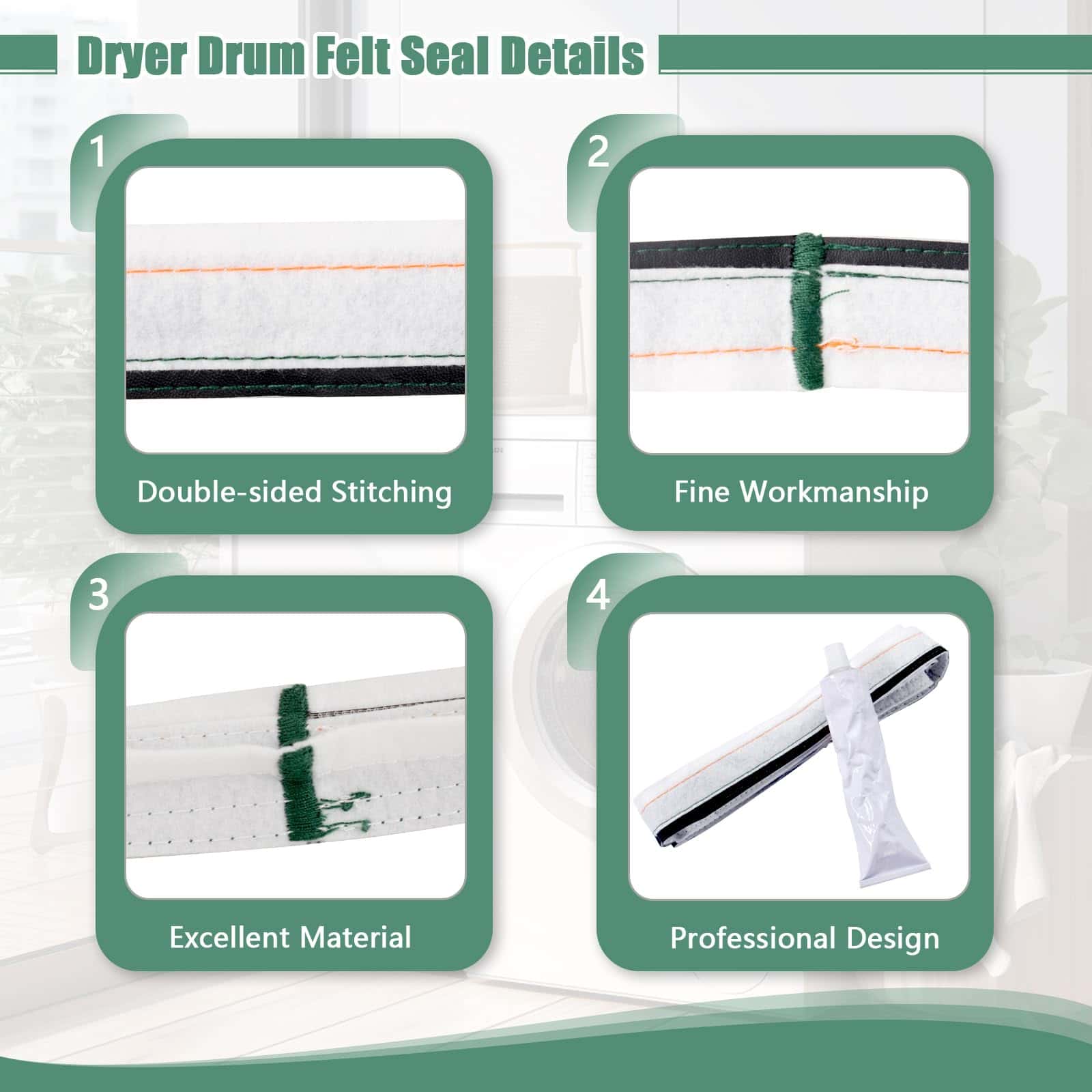 2. Fibra de vidrio, superior y resistente El sello de fieltro de fieltro trasero de la secadora está hecho de material resistente a altas temperaturas de fibra de vidrio de alta calidad con una mayor elasticidad, resistente, buen rendimiento de sellado y características a prueba de rasgaduras, con adición adicional de adhesivo de alta temperatura. Todos los productos han pasado estrictas inspecciones de calidad.