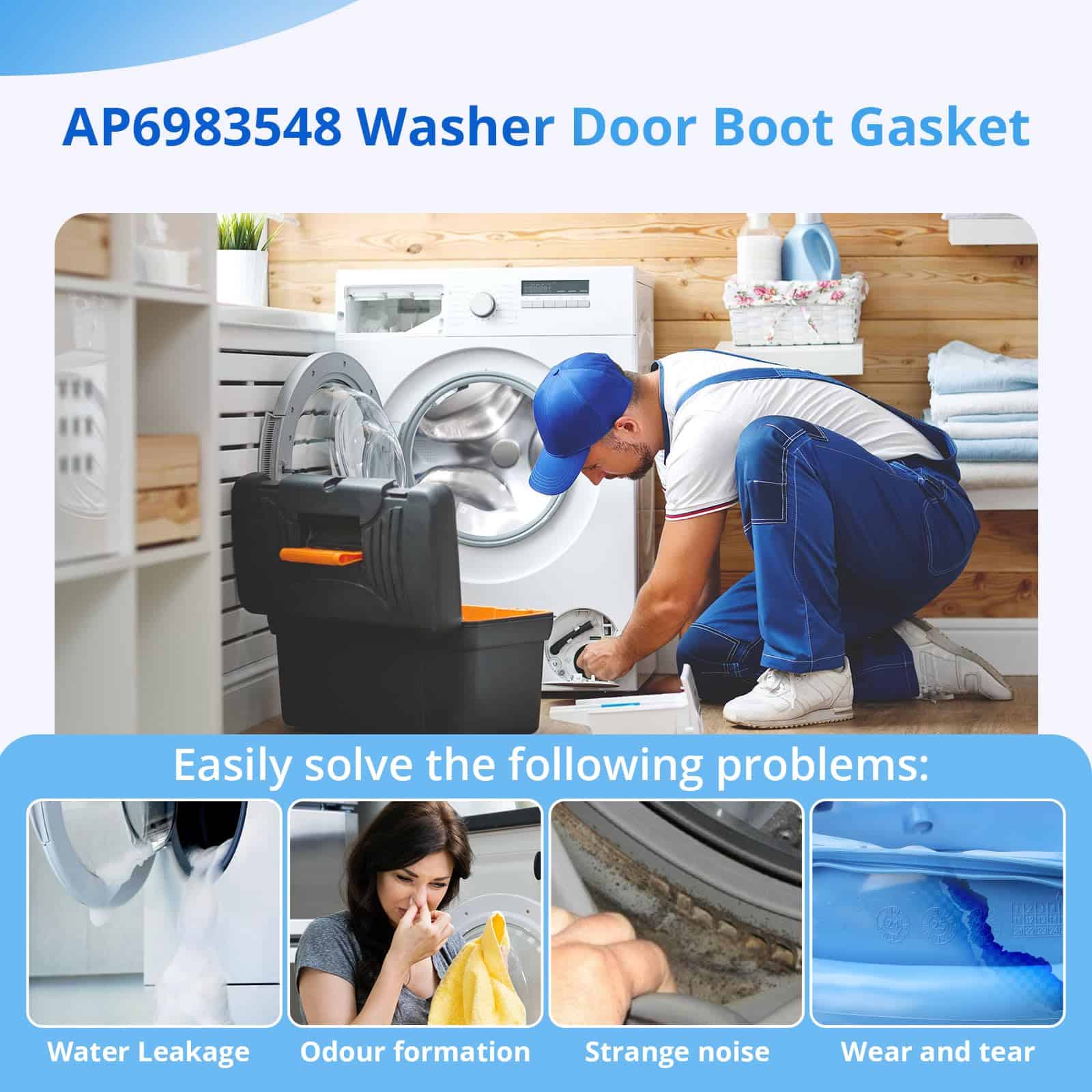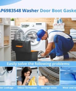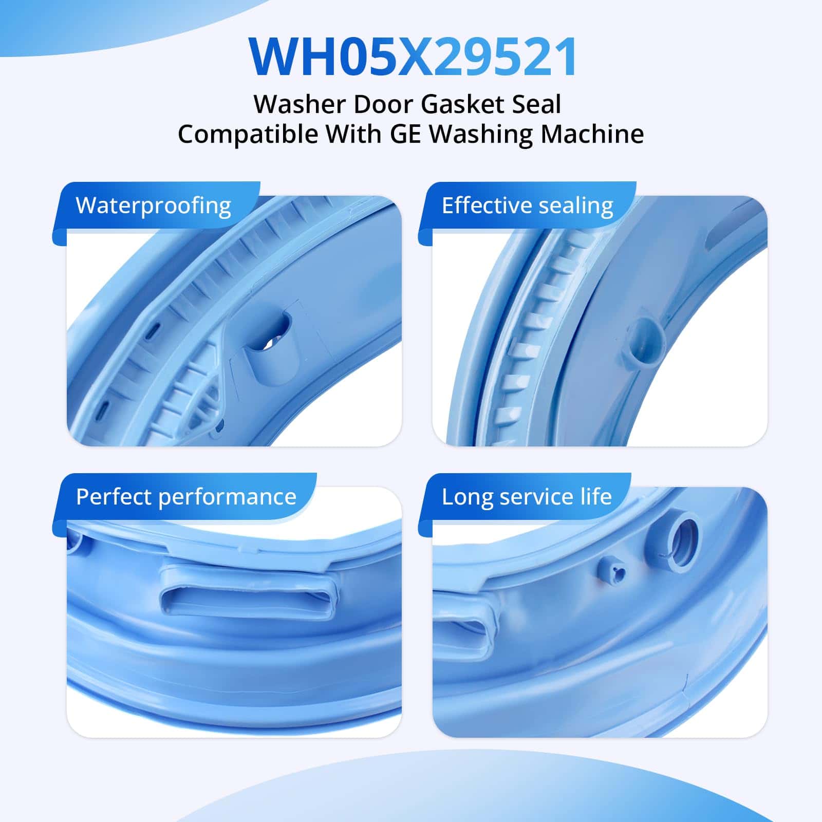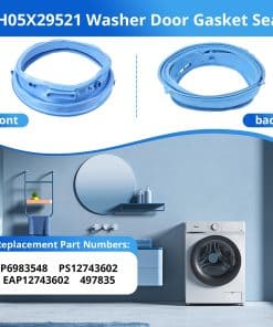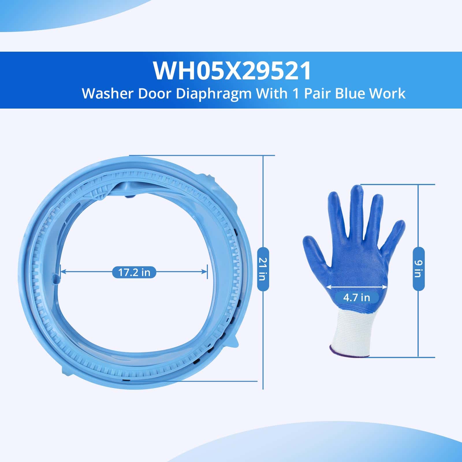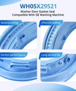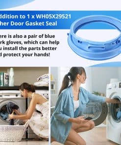 5. KIT INCLUYE: 1 x Sello de goma de la puerta de la lavadora WH05X29521 y 1 x par de guantes de trabajo azules. Reemplace el sello de la puerta de la lavadora si está viejo, dañado, con fugas o ruidoso en la puerta.