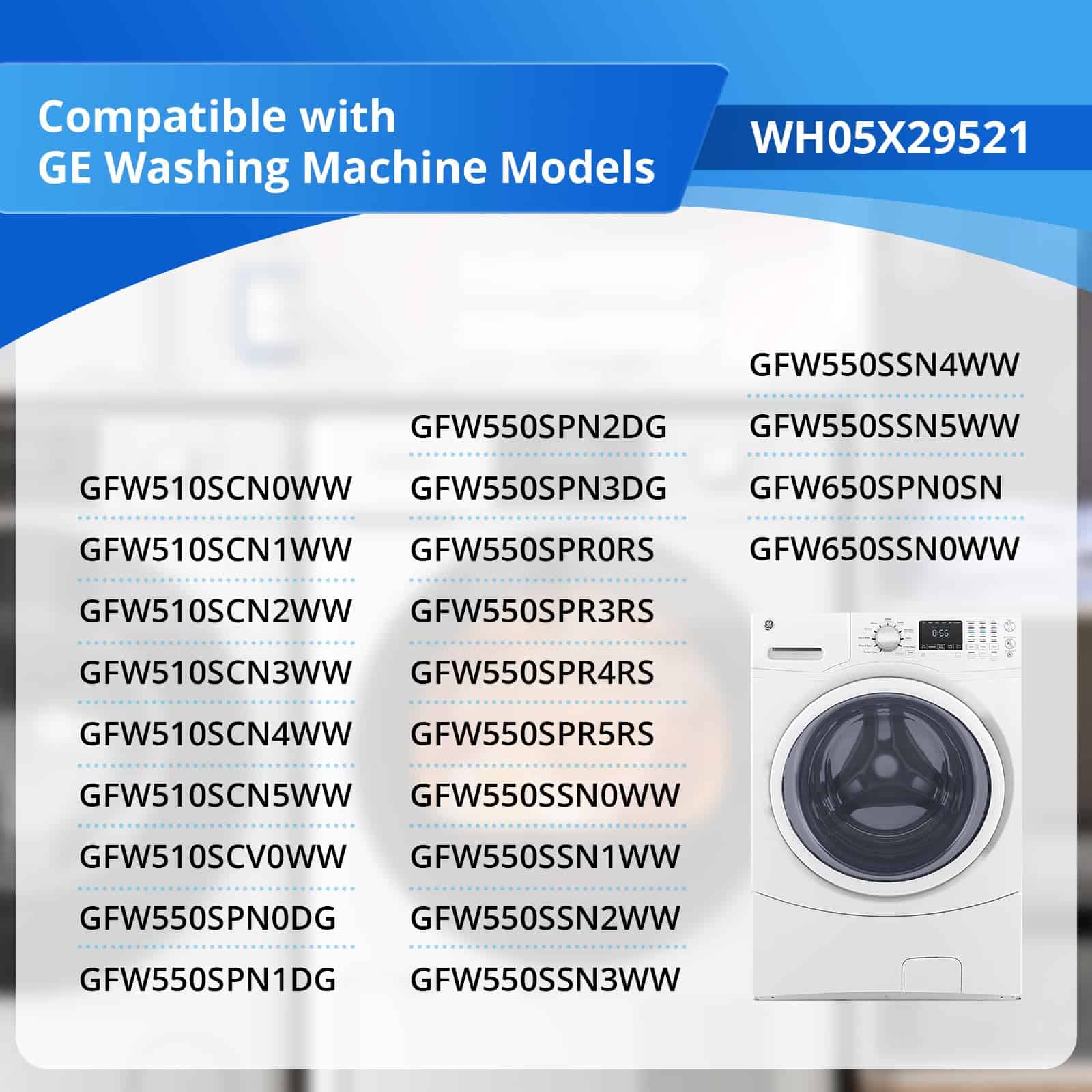 3. MARCAS COMPATIBLES: El sello de goma de la puerta WH05X29521 es compatible con los modelos de lavadoras GE: GFW510SCN0WW, GFW510SCN1WW, GFW510SCN2WW, GFW510SCN3WW, GFW510SCN4WW, GFW510SCN5WW, GFW510SCV0WW, GFW550SPN0DG, GFW550SPN1DG, GFW550SPN2DG, GFW550SPN3DG, GFW550SPR0RS, GFW550SPR3RS, GFW550SPR4RS, GFW550SPR5RS, GFW550SSN0WW, GFW550SSN1WW, GFW550SSN2WW, GFW550SSN3WW, GFW550SSN4WW, GFW550SSN5WW, GFW650SPN0SN, GFW650SSN0WW.