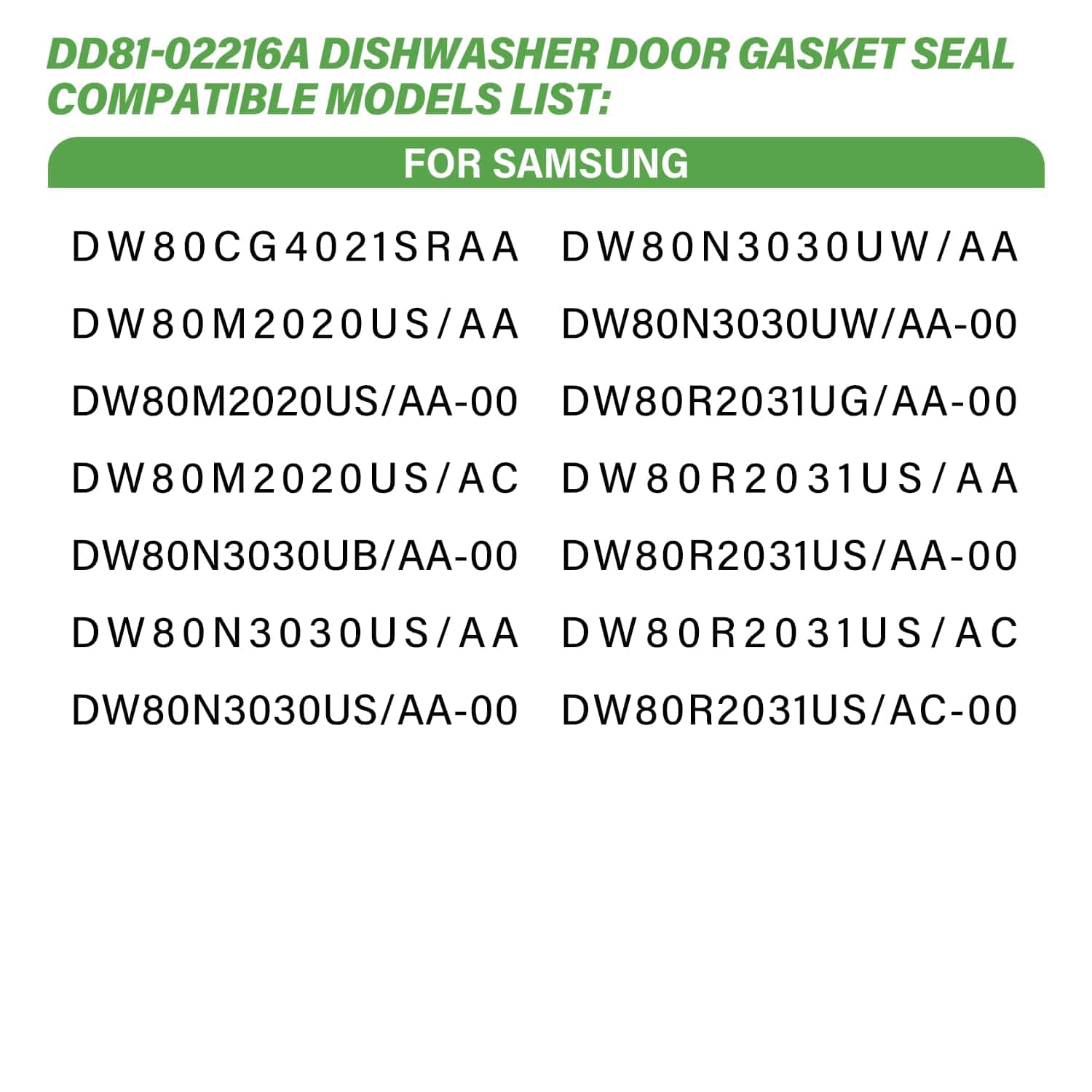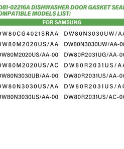 3. Compatible Con El sello de goma de la puerta del lavavajillas DD81-02216A es compatible con los modelos de Samsung: DW80CG4021SRAA, DW80M2020US/AA, DW80M2020US/AA-00, DW80M2020US/AC, DW80N3030UB/AA-00, DW80N3030US/AA, DW80N3030US/AA-00, DW80N3030UW/AA, DW80N3030UW/AA-00, DW80R2031UG/AA-00, DW80R2031US/AA, DW80R2031US/AA-00, DW80R2031US/AC, DW80R2031US/AC-00.
