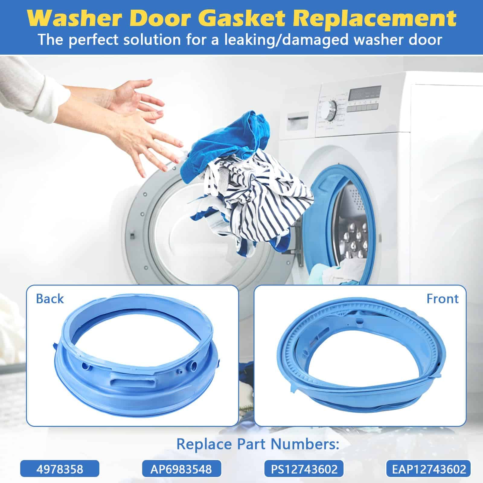 1. Reemplace los números de pieza: El sello de goma para puerta de lavadora WH05X29521 es compatible con las lavadoras GE, reemplaza 4978358, AP6983548, PS12743602, EAP12743602.