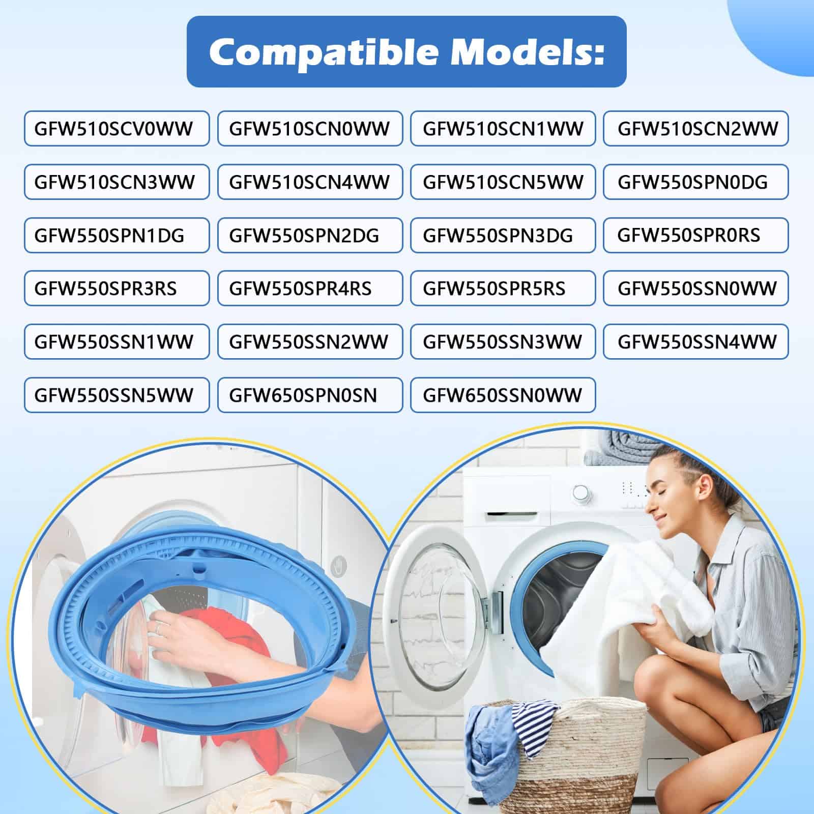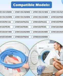 2. Modelos compatibles: El sello de goma para puerta es compatible con los modelos de lavadoras GE GFW510SCV0WW, GFW510SCN0WW, GFW510SCN1WW, GFW510SCN2WW, GFW510SCN3WW, GFW510SCN4WW, GFW510SCN5WW, GFW550SPN0DG, GFW550SPN1DG, GFW550SPN2DG, GFW550SPN3DG, GFW550SPR0RS, GFW550SPR3RS, GFW550SPR4RS, GFW550SPR5RS, GFW550SSN0WW, GFW550SSN1WW, GFW550SSN2WW, GFW550SSN3WW, GFW550SSN4WW, GFW550SSN5WW, GFW650SPN0SN, GFW650SSN0WW. Por favor, verifique los números de modelo antes de comprar.