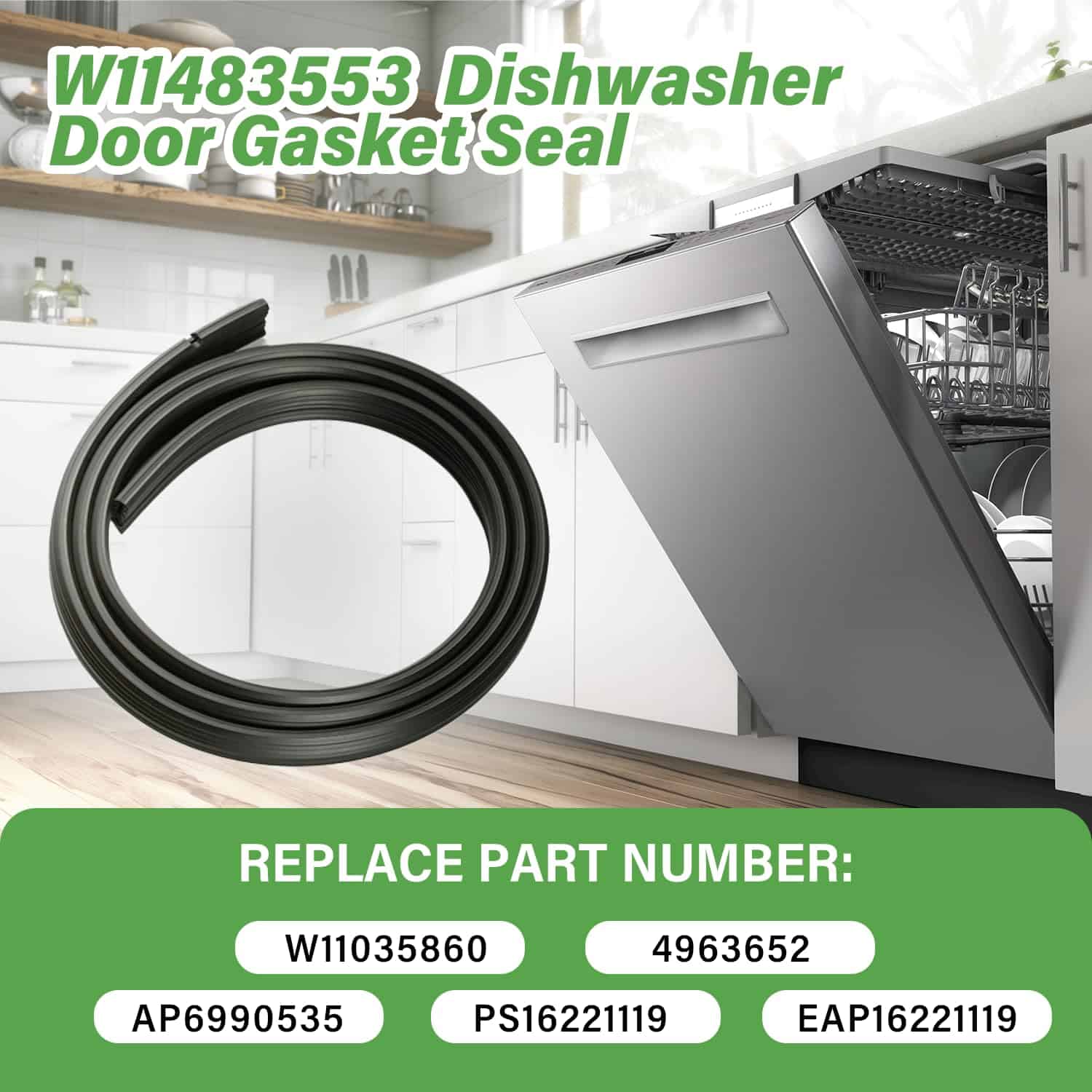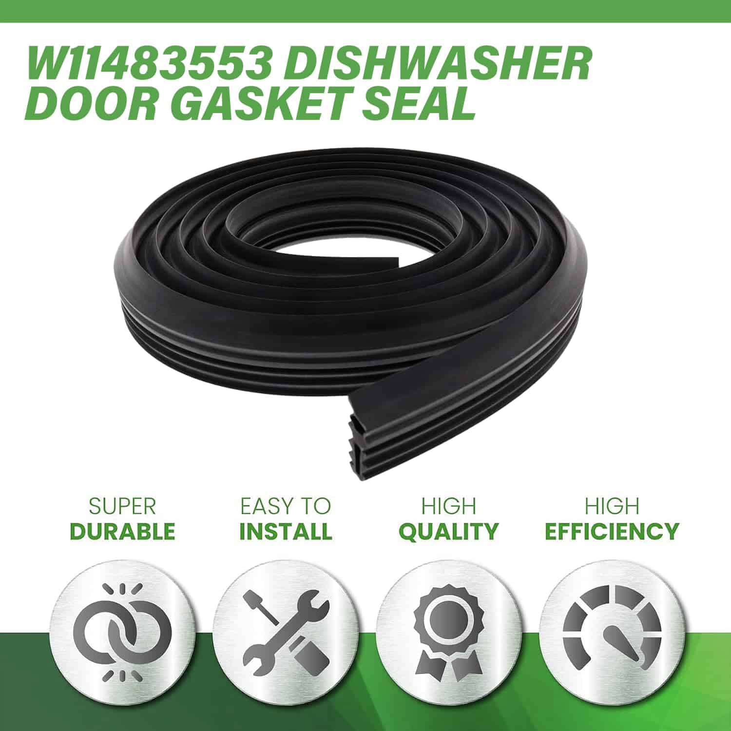 El sello de goma para tapa de lavavajillas W11483553 es una pieza de repuesto de calidad que se encarga de crear un sello impermeable entre la puerta del lavavajillas y la bañera. Este sello reemplaza a W11035860, 4963652, AP6990535, PS16221119, EAP16221119. Compatible con Whirlpool, Kenmore, Kitchen Aid, Jenn Air. El sello de goma para tapa de lavavajillas W11483553 soluciona problemas como fugas de agua desde la parte inferior durante el funcionamiento, desgarros, grietas o daños, exceso de humedad o condensación alrededor del lavavajillas, etc. Contáctenos para consultas adicionales y cualquier otra necesidad de piezas para electrodomésticos. ¡Nos esforzaremos al máximo para resolver el problema, la satisfacción del cliente es nuestra incansable búsqueda.