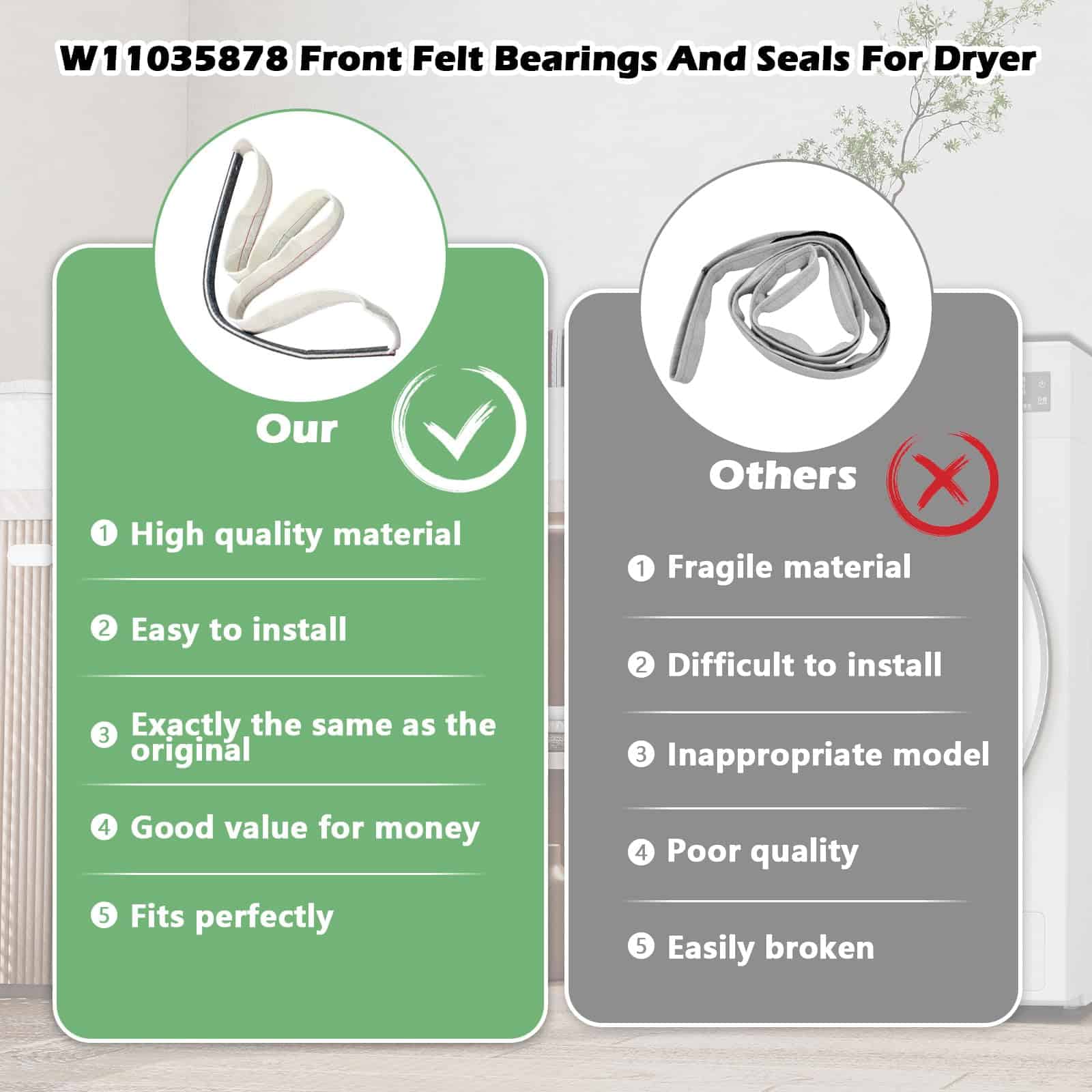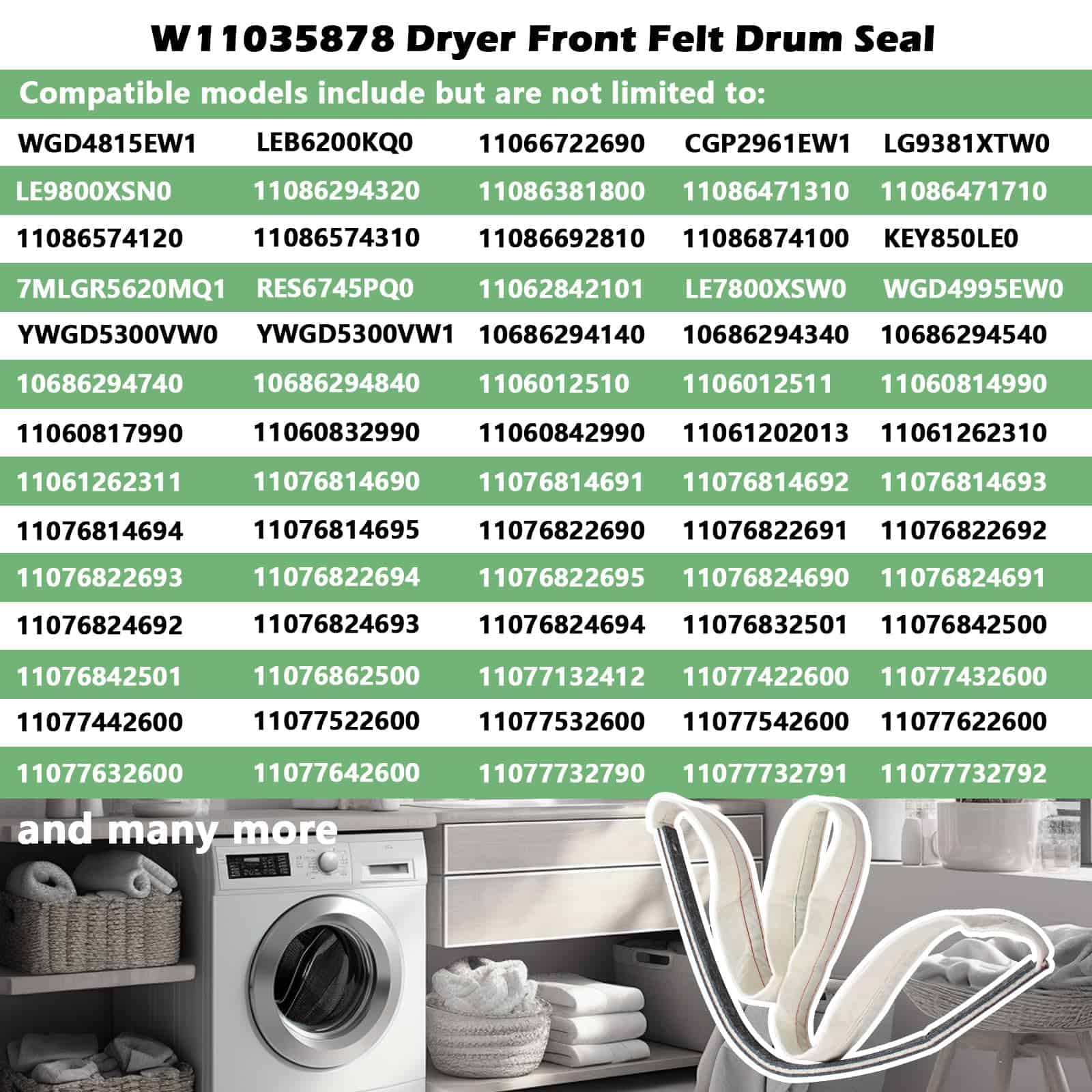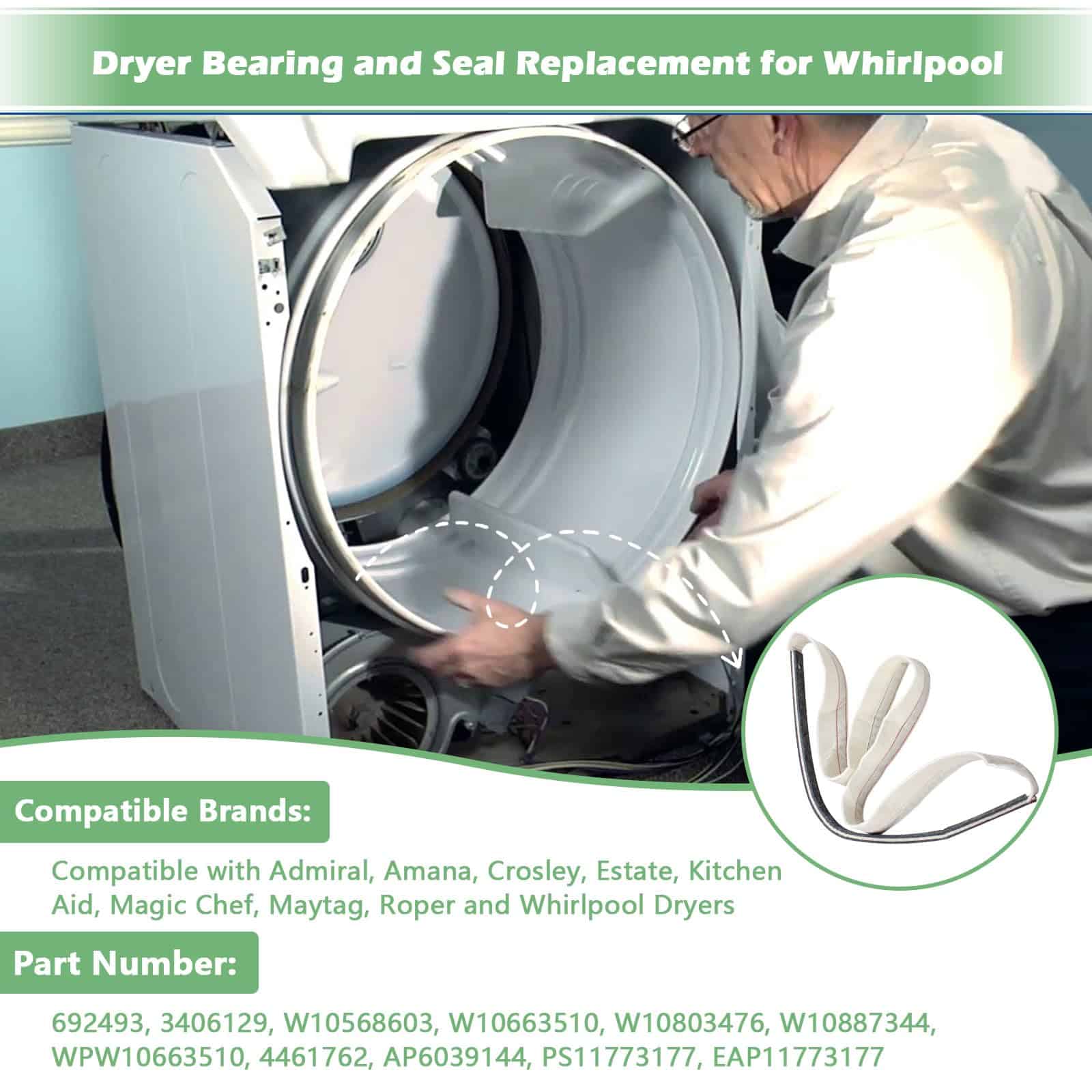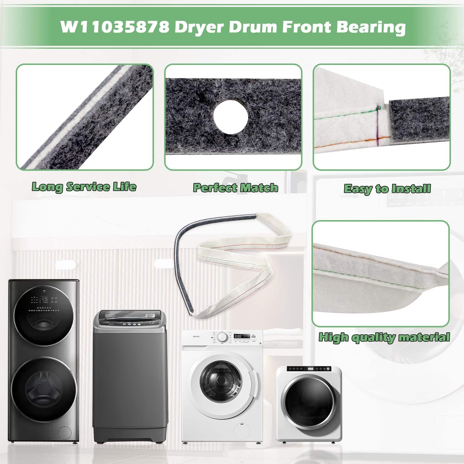 En resumen, W11035878 Dryer Front Felt Drum Seal & Bearing Part es una pieza esencial para mantener el buen funcionamiento de su secadora y prolongar su vida útil de manera efectiva y sencilla.