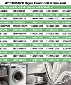 W11035878 Dryer Front Felt Drum Seal & Bearing Part es una pieza de repuesto de alta calidad para diversos modelos de secadoras Admiral, Amana, Crosley, Estate, Maytag, Roper y Whirlpool. Está fabricado con materiales duraderos que garantizan un rendimiento duradero y una vida útil prolongada.