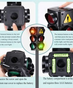 Tamaño 8.2 8.2 28 pulgadas Peso: alrededor de 0.85 kg Material: Plástico ¡A los niños les encantará esta señal de tráfico de 4 vías que incluye luces y sonidos de tráfico y cruce! Hay semáforos en la parte delantera y trasera y señales de cruce peatonal en cada lado para un valor de juego adicional. Una forma divertida e interactiva de introducir a los niños en la conciencia de la seguridad vial. Las luces cambian de color en tu elección de ajustes automáticos o manuales. Un compañero perfecto para cualquier vehículo para montar, triciclo o bicicleta, Requiere 3 pilas AAA (no incluidas).