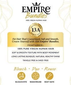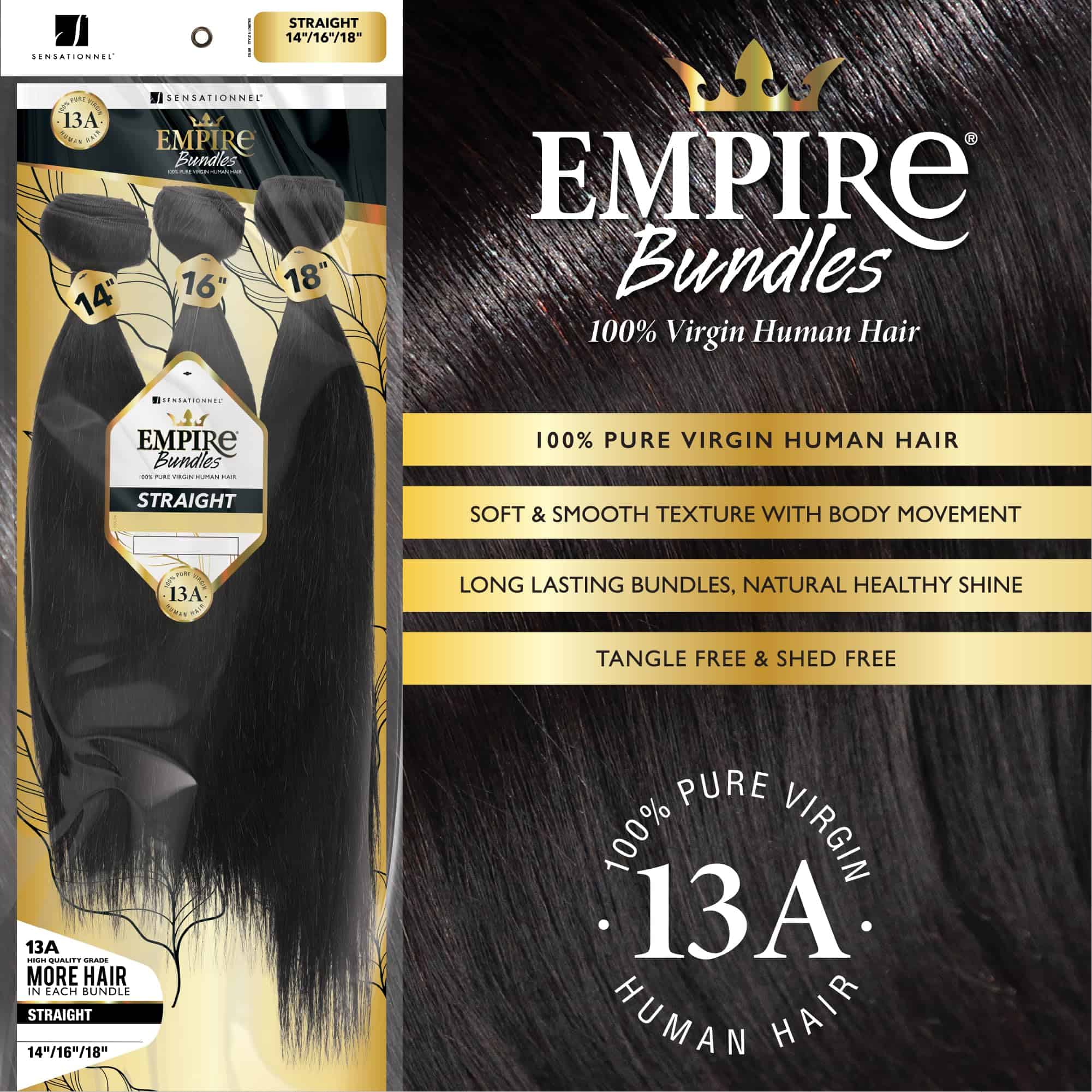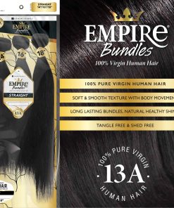 Las extensiones de Empire by Sensationnel son el producto de cabello en paquetes con la misma calidad que el cabello Empire yaki. Está hecho con cabello humano virgen de grado 13a y hay una variedad de combinaciones de longitud y una variedad de estilos ondulados para elegir. Estos paquetes también son seguros para blanquear, decolorar y teñir.