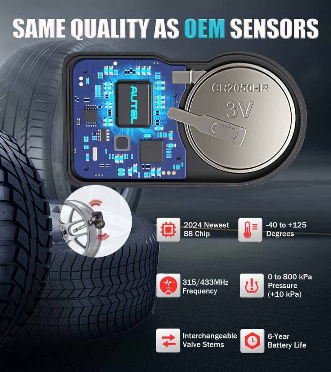 4. MISMA CALIDAD QUE LOS SENSORES OEM Los sensores TPMS de Autel tienen una vida útil ultralarga de 5+ años, una distancia de trabajo de 24,000+ millas, lectura de presión de 0 a 800 kPa a 10 kPa, de -40 a 120 grados de calor y frío, todo lo cual cumple con la norma de prueba SAE J1205 / J1206 / J2657. El cuerpo del TPMS 1-Sensor pesa solo 11g, lo que lo hace significativamente más ligero que la mayoría de los sensores en el mercado.