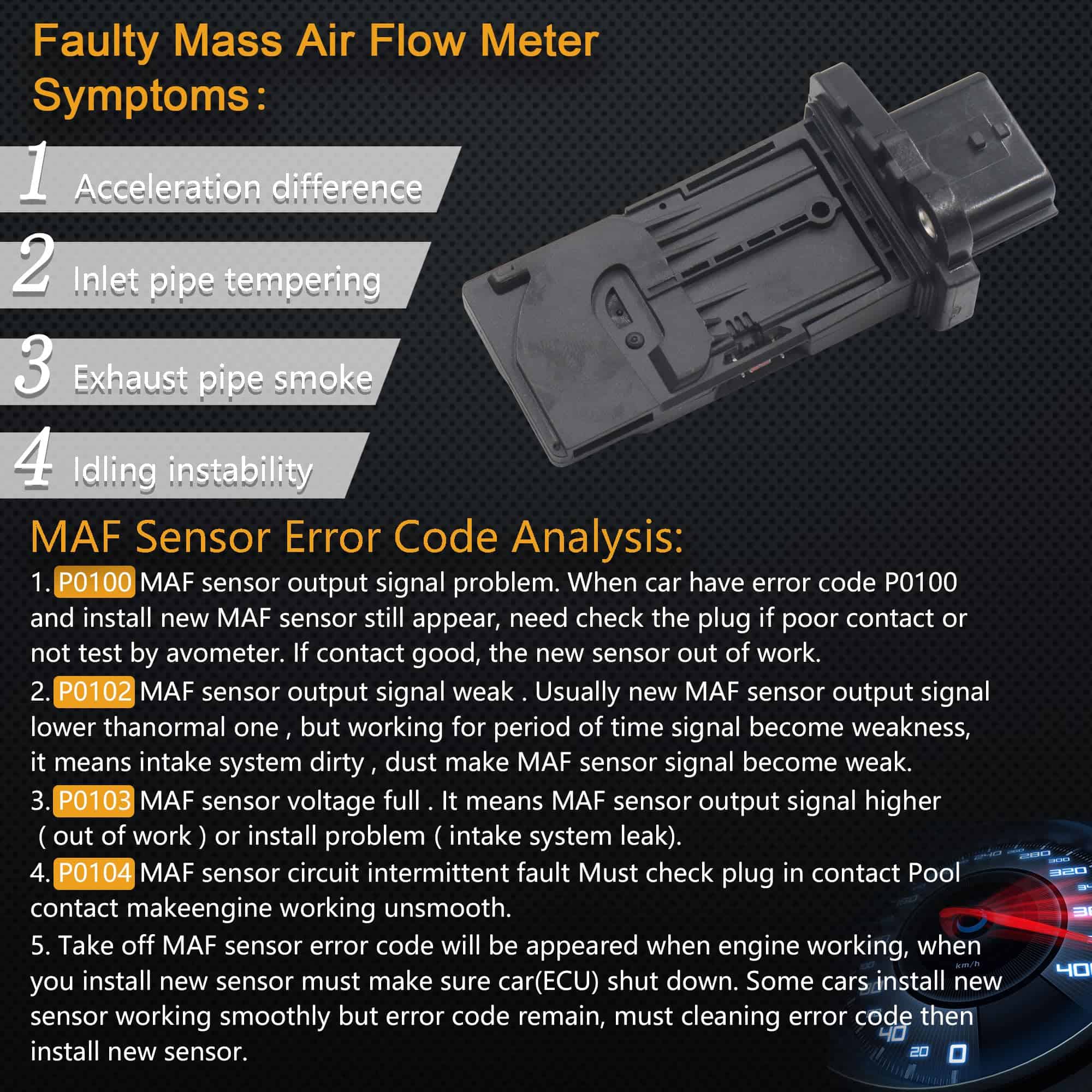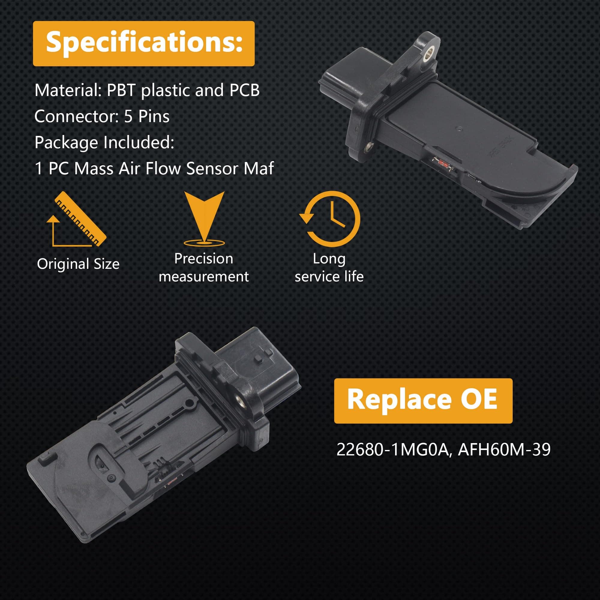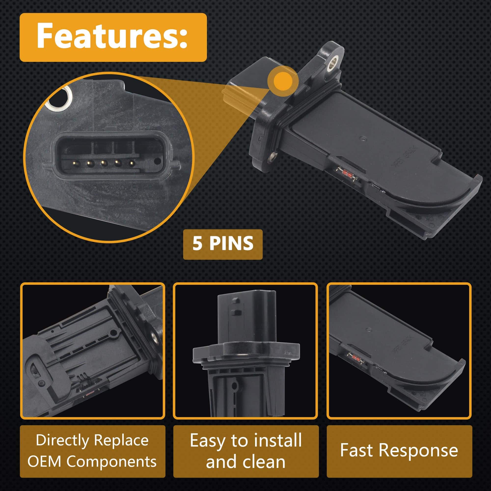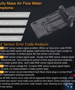 Un sensor de flujo de aire masa calcula el oxígeno que fluye hacia su motor para la proporción ideal de aire a combustible, lo que ayuda a aumentar la eficiencia del motor. El acelerador del motor se abre cuando se presiona el acelerador, permitiendo que más aire fluya alrededor del alambre caliente. Un chip electrónico y la PCM trabajan con la señal de flujo de aire para calcular cuánto combustible debe inyectarse. Esta medición ayuda a mantener la proporción ideal de aire a combustible y el rendimiento de gasolina óptimo. Equipos calificados y pruebas de vanguardia, junto con una inspección de calidad rigurosa al 100%, garantizan una experiencia al cliente impecable. Tiempo de respuesta rápido y durabilidad. Ligero y portátil, fácil de instalar y limpiar, y directamente reemplazable.