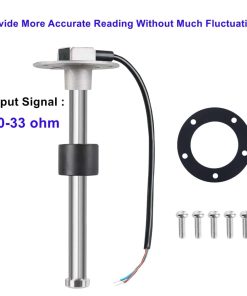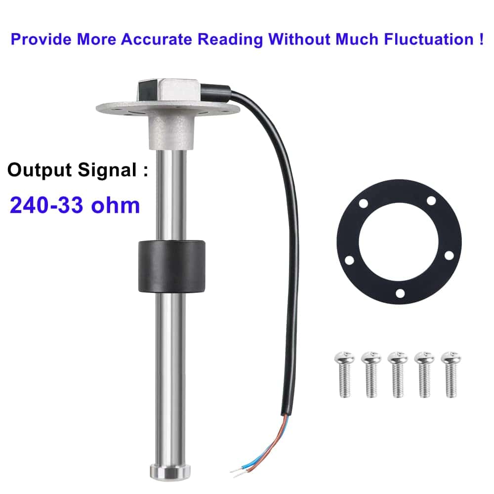 El sensor de nivel de combustible para tanques de acero inoxidable de Sucicago es mucho más preciso y fiable que el antiguo sistema de brazo y flotador. El cliente puede comprarlo junto con un medidor de nivel de combustible o medidor de nivel de agua de Sucicago. Están diseñados para monitorear el nivel de combustible, diésel, gasolina o agua en el tanque. Este sensor del barco también funcionará con cualquier medidor de nivel de combustible/agua con rango de señal de salida estándar americano de 240-33 ohmios (vacío – lleno). Material del cuerpo: acero inoxidable Cable: PVC Junta NBR: 1 tornillo de acero inoxidable métrico: 5 unidades Métodos de montaje: patrón estándar de 5 orificios SAE. Rango de protección: IP65. Señal de salida: estándar americano de 240-33 ohmios (240 ohmios en vacío, 33 ohmios en lleno). Rango de resolución: 10 mm: 4 ,5 ,6 ,7 21 mm: 8 ,9 ,10 ,11 ,12 ,13 Información del paquete: 1 x Unidad de envío de combustible Sucicago 1 x Junta 5 x Tornillos M5 0.8 Largo (16 mm) para la instalación de la unidad de envío INSTALACIÓN DE CABLEADO APROPIADO: -Conecta el cable de tierra (azul) de la unidad de envío de Sucicago a un gancho de tierra común. -Conecta el cable de señal (marrón) de la unidad de envío de Sucicago al medidor. Si tu medidor tiene conexiones codificadas por colores, mantén este código al conectar los cables de señal y tierra.