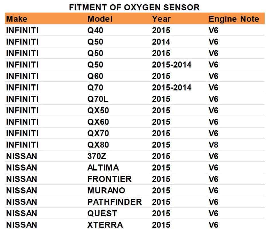 3. Aplicación – Reemplazo para Infiniti Q40 2015 3.7L , Q50 2015 3.7L , Q50 2014 3.7L , Q50 2015-2014 3.5L , Q60 2015 3.7L , Q70 2015-2014 3.7L , Q70 2015-2014 3.5L , Q70L 2015 3.7L , Qx50 2015 3.7L , Qx60 2015 3.5L , Qx70 2015 3.7L , Qx80 2015 5.6L.