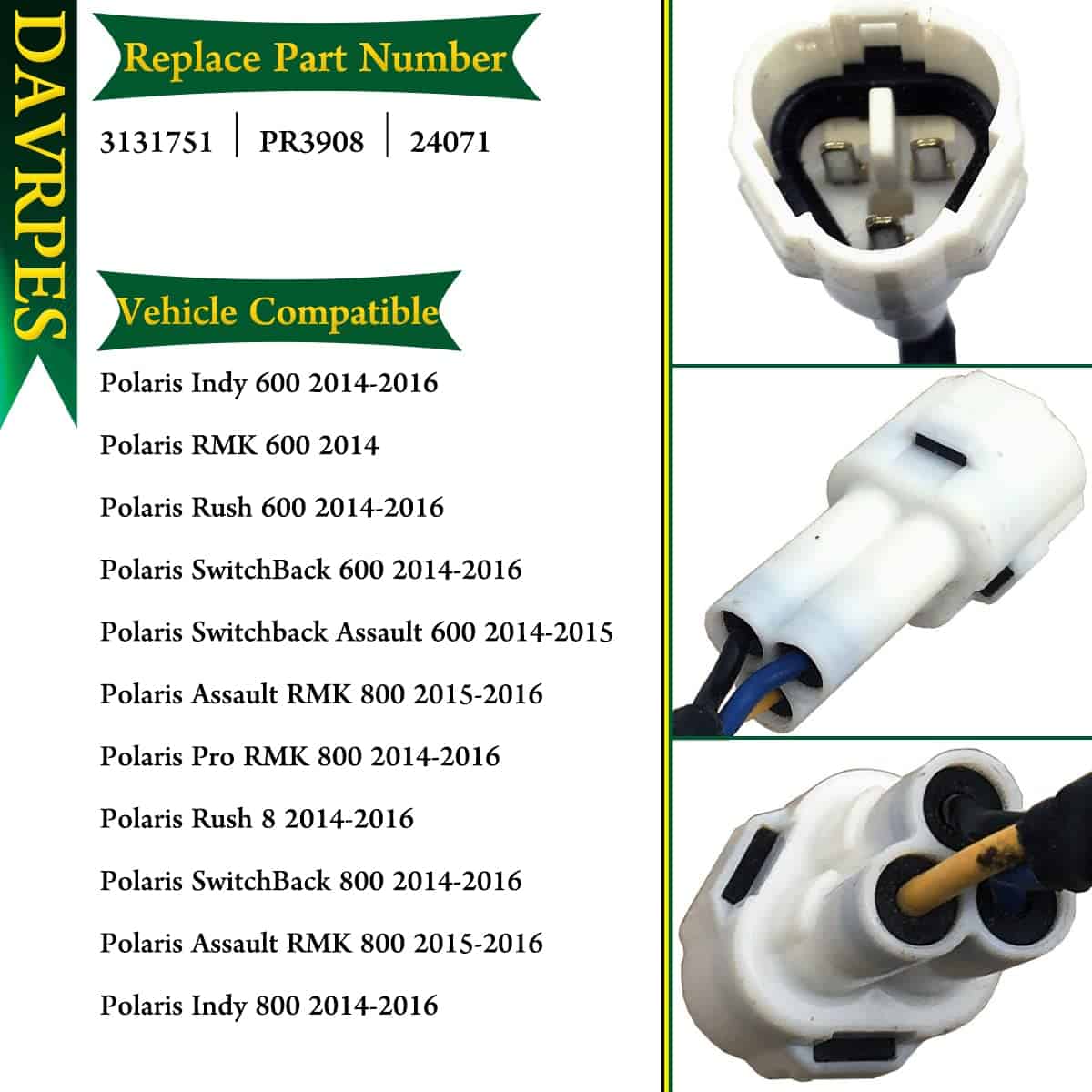 El sensor de posición del acelerador TPS DAVRPES 3131751 es compatible con varios modelos de Polaris, incluidos 600 AXYS Voyageur, 600 INDY RMK Switchback Rush, 800 Rush AXYS, 800 INDY RMK, 800 Switchback y 800 Titan SP. Este sensor ha sido fabricado con materiales de alta calidad y precisión para cumplir con los estándares OE, lo que garantiza una durabilidad excepcional. Su instalación es sencilla, sin necesidad de empalmar cables. Además, viene con una garantía de 2 años y un servicio post-venta profesional para brindarte tranquilidad. Si tienes alguna pregunta o problema, nuestro equipo de atención al cliente está disponible para ayudarte en todo momento.