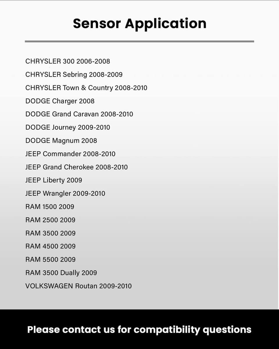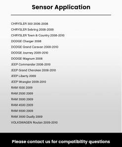 Un adecuado sensor TPMS puede ser necesario para vehículos que cumplen con sensores TPMS de re-entrenamiento manual instalación y emparejamiento requiere cierto nivel de conocimiento, habilidad y equipo especial. Recomendamos mecánicos certificados para realizar la tarea. Los sensores TPMS de Mobiletron están fabricados cumpliendo con normas ISO, SAE y GB y diseñados para reemplazar los sensores originales en el mercado de accesorios automotrices. Este sensor está preprogramado para funcionar con los vehículos compatibles listados abajo. Chrysler: 2006-2008 300, 2008-2009 Sebring, 2008-2010 Town & Country. Dodge: 2008-2010 Grand Caravan, 2009-2010 Journey, 2008 Magnum. Jeep: 2008-2010 Commander, 2008-2010 Grand Cherokee, 2009 Liberty, 2009-2010 Wrangler. RAM: 2009 1500, 2009 2500, 2009 3500, 2009 4500, 2009 5500, 2009 3500 Dually. Volkswagen: 2009-2014 Routan.