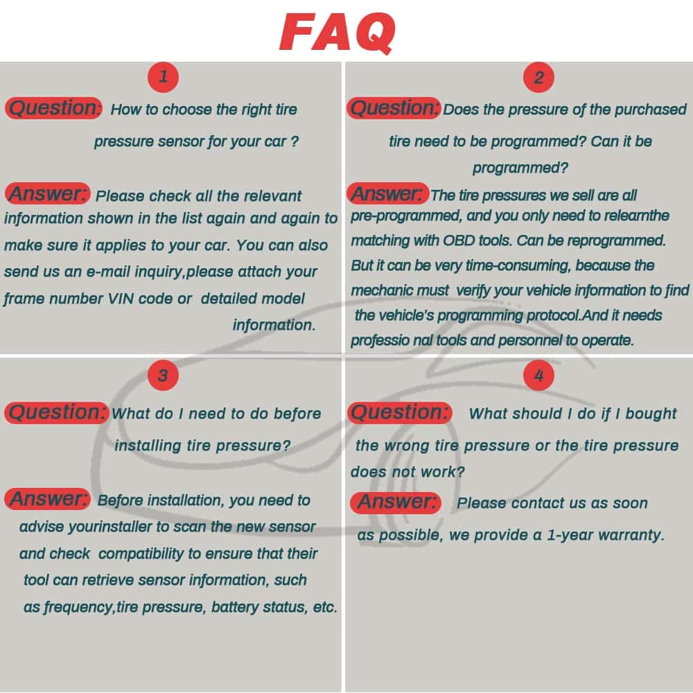 Antes de realizar el pedido, verifique el código VIN de su auto, modelo, año. Consulte el manual del propietario para ver qué procedimiento se requiere para su vehículo en particular al instalar nuevos sensores TPMS.