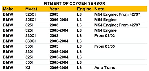 Sensor de relación aire/combustible de oxígeno compatible con BMW X3 330Ci 325Ci 325i 525i 530i 2.5L 3.0L Sensor O2 de aguas arriba compatible con BMW 325CI 2003 Motor M54; Desde 42797 2.5L, 325CI 2006-2004 Motor M54 2.5L, 325I 2003 Motor M54; Desde 42797 2.5L, 325I 2005-2004 Motor M54 2.5L, 330CI 2003 Desde 03/03 3L, 330CI 2006-2004 3L, 330I 2003 Desde 03/03 3L, 330I 2005-2004 3L, 525I 2005-2004 2.5L, 530I 2005-2004 3L, X3 2006-2004 Transmisión automática 3L